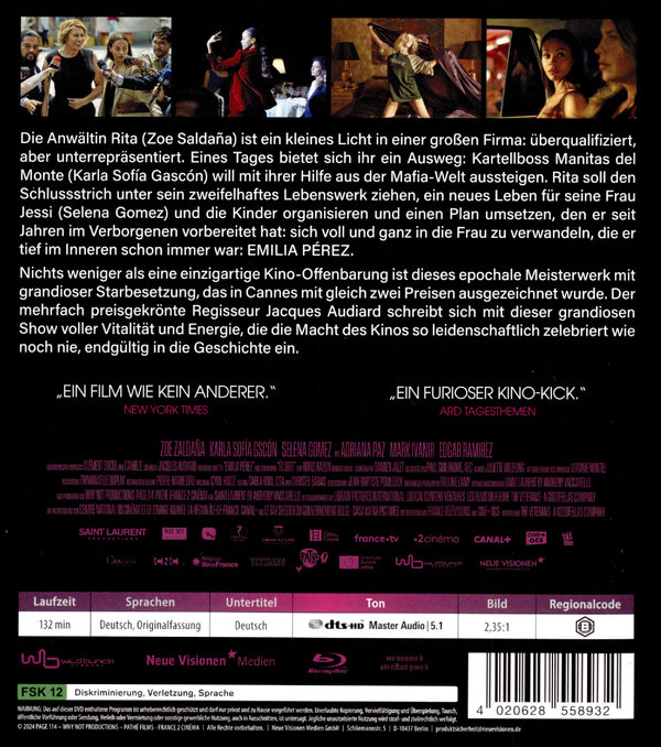 Die Anwältin Rita (Zoe Saldaña) ist ein kleines Licht in einer großen Firma: überqualifiziert, aber unterrepräsentiert. Eines Tages bietet sich ihr ein Ausweg: Kartellboss Manitas del Monte (Karla Sofía Gascón) will mit ihrer Hilfe aus der Mafia-Welt aussteigen. Rita soll den Schlussstrich unter sein zweifelhaftes Lebenswerk ziehen, ein neues Leben für seine Frau Jessi (Selena Gomez) und die Kinder organisieren und einen Plan umsetzen, den er seit Jahren im Verborgenen vorbereitet hat: sich voll und ganz in die Frau zu verwandeln, die er tief im Inneren schon immer war: EMILIA PÉREZ.