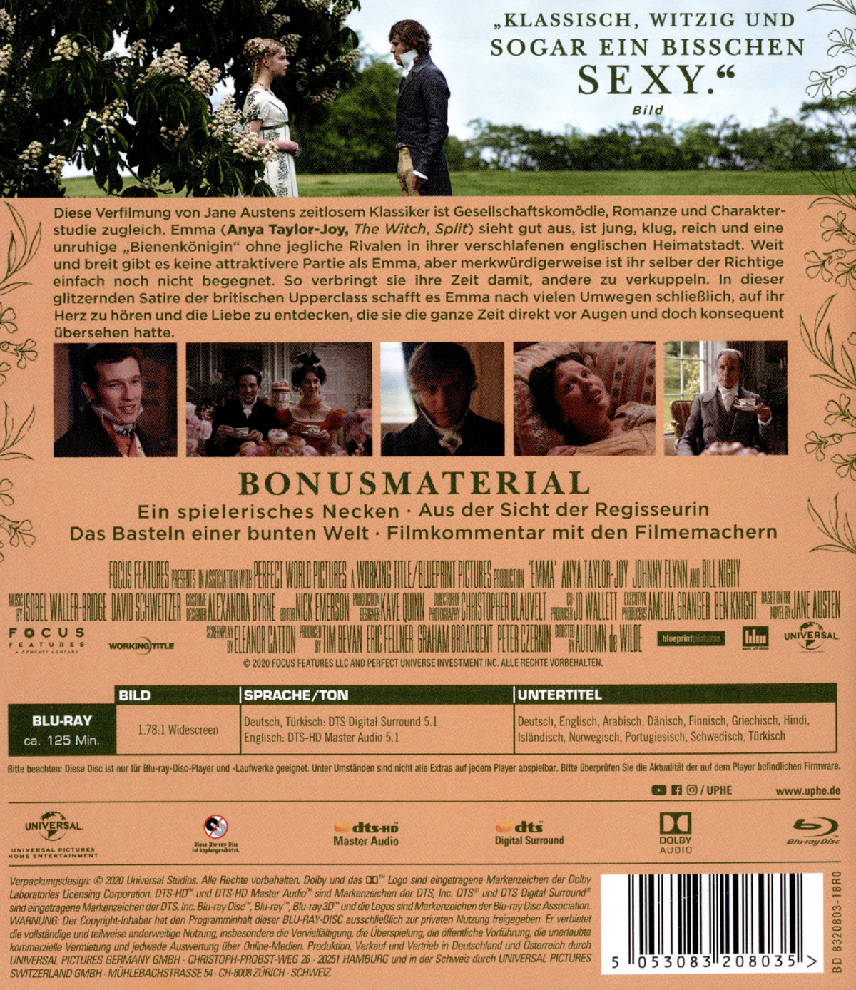 Diese Verfilmung von Jane Austens zeitlosem Klassiker ist Gesellschaftskomödie, Romanze und Charakterstudie zugleich.Emma (Anya Taylor-Joy, "The Witch", "Split") sieht gut aus, ist jung, klug, reich und eine unruhige "Bienenkönigin" ohne jegliche Rivalen in ihrer verschlafenen englischen Heimatstadt. Weit und breit gibt es keine attraktivere Partie als Emma, aber merkwürdigerweise ist ihr selber der Richtige einfach noch nicht begegnet. So verbringt sie ihre Zeit damit, andere zu verkuppeln. In dieser glitzernden Satire der britischen Upperclass schafft es Emma nach vielen Umwegen schließlich, auf ihr Herz zu hören und die Liebe zu entdecken, die sie die ganze Zeit direkt vor Augen und doch konsequent übersehen hatte."Klassisch, witzig und sogar ein bisschen sexy" (Bild)"Eine echte Heldin unserer Zeit" (Hamburger Abendblatt)