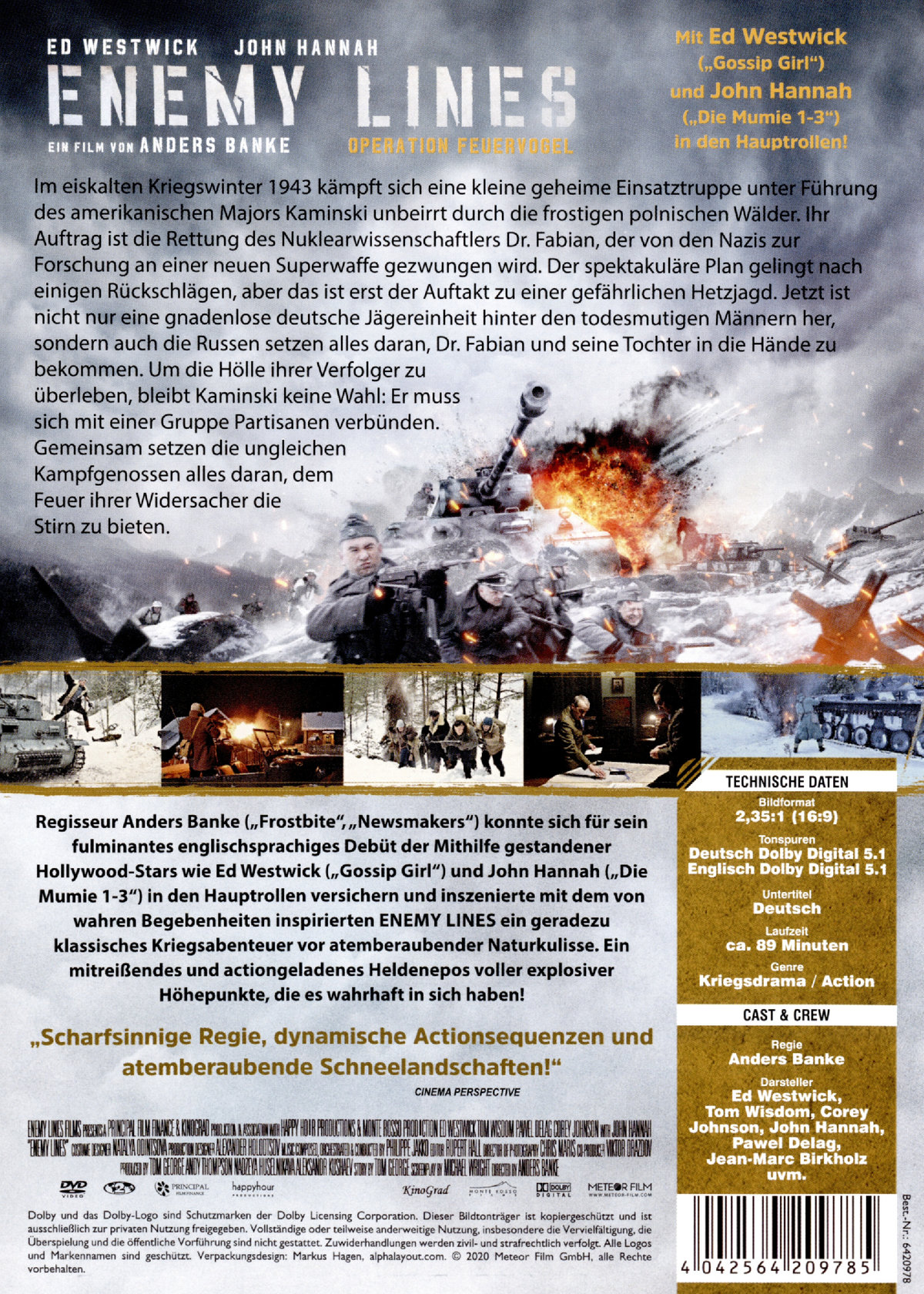 Regisseur Anders Banke ("Frostbite", "Newsmakers") konnte sich für sein fulminantes englischsprachiges Debüt der Mithilfe gestandener Hollywood-Stars wie Ed Westwick („Gossip Girl") und John Hannah ("Die Mumie 1-3") in den Hauptrollen versichern und inszenierte mit dem von wahren Begebenheiten inspirierten ENEMY LINES ein geradezu klassisches Kriegsabenteuer vor atemberaubender Naturkulisse. Ein mitreißendes und actiongeladenes Heldenepos voller explosiver Höhepunkte, die es wahrhaft in sich haben!