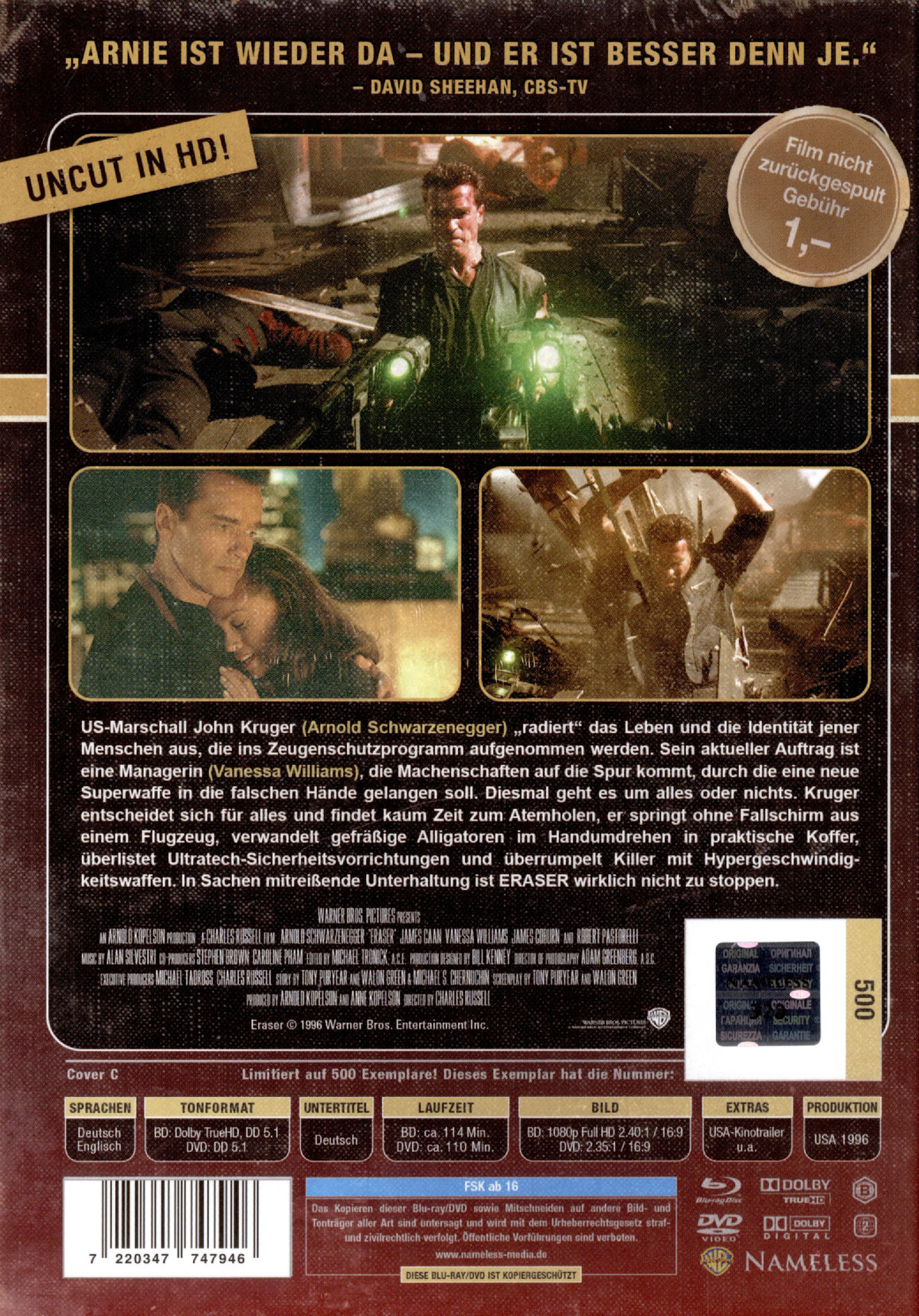 Inhalt: US-Marschall John Kruger (Arnold Schwarzenegger) „radiert“ das Leben und die Identität jener Menschen aus, die ins Zeugenschutzprogramm aufgenommen werden. Sein aktueller Auftrag ist eine Managerin (Vanessa Williams), die Machenschaften auf die Spur kommt, durch die eine neue Superwaffe in die falschen Hände gelangen soll. Diesmal geht es um alles oder nichts. Kruger entscheidet sich für alles und findet kaum Zeit zum Atemholen, er springt ohne Fallschirm aus einem Flugzeug, verwandelt gefräßige Alligatoren im Handumdrehen in praktische Koffer, überlistet Ultratech-Sicherheitsvorrichtungen und überrumpelt Killer mit Hypergeschwindigkeitswaffen. In Sachen mitreißende Unterhaltung ist ERASER wirklich nicht zu stoppen.