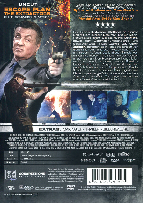 Diesmal wirds persönlich! Nach den ersten beiden fulminanten Teilen der Escape Plan-Reihe hauen Sylvester Stallone und Dave Bautista mehr auf den Putz denn je! Im Gepäck haben sie auch noch die Martial Arts-Größe Max Zhang! Escape Plan – The Extractors: Blut, Schweiß und Action!