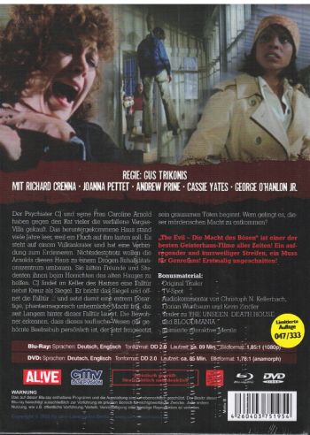 | Zus.Info | - Auf 333 Stück limitiertes Mediabook - Umfangreiches Booklet von Christoph N. Kellerbach - Original Trailer - TV-Spot - Audiokommentar von Christoph N. Kellerbach & Florian Wurfbaum - Trailer zu THE UNSEEN, DEATH HOUSE und BLOODMANIA - animierte interaktive Menus - DVD-Version Zusatzinfo: "The Evil - Die Macht des Bösen" ist einer der besten Geisterhaus-Filme aller Zeiten! Ein aufregender und kurzweiliger Streifen, ein Muss fürGenrefans! Erstmalig ungeschnitten! |