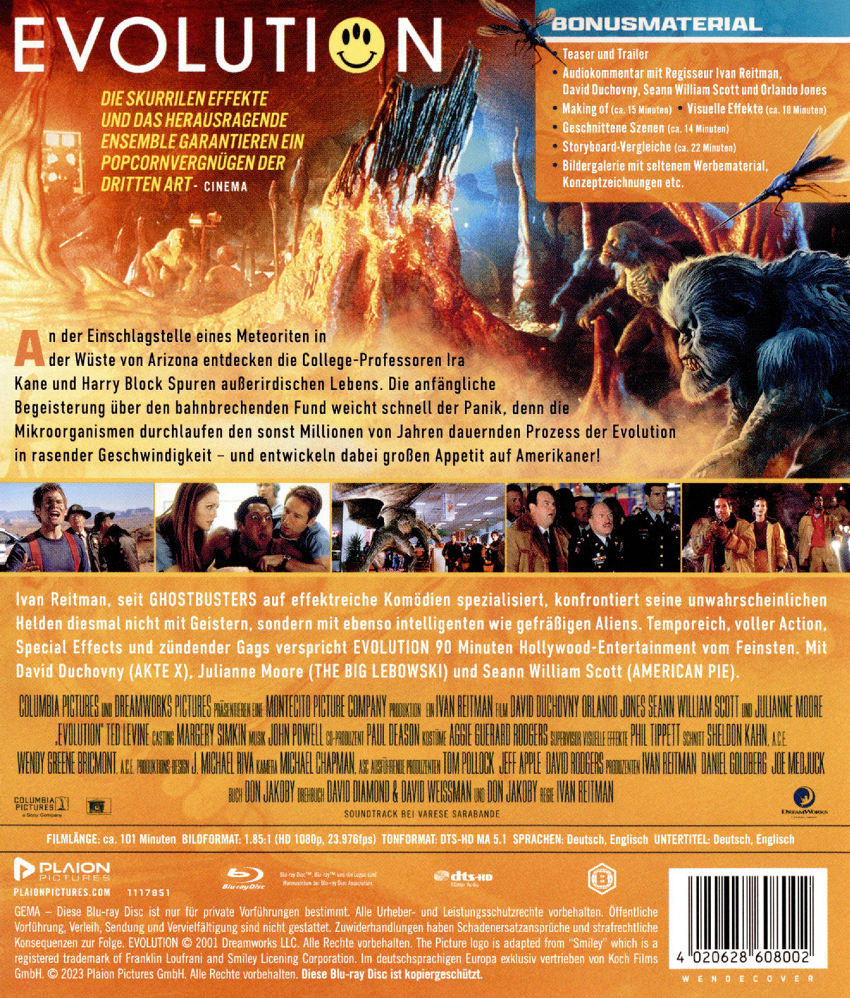 Ivan Reitman, seit GHOSTBUSTERS auf effektreiche Komödien spezialisiert, konfrontiert seine unwahrscheinlichen Helden diesmal nicht mit Geistern, sondern mit ebenso intelligenten wie gefräßigen Aliens. Temporeich, voller Action, Special Effects und zündender Gags verspricht EVOLUTION 90 Minuten Hollywood-Entertainment vom Feinsten. Mit David Duchovny (AKTE X), Julianne Moore (THE BIG LEBOWSKI) und Seann William Scott (AMERICAN PIE).