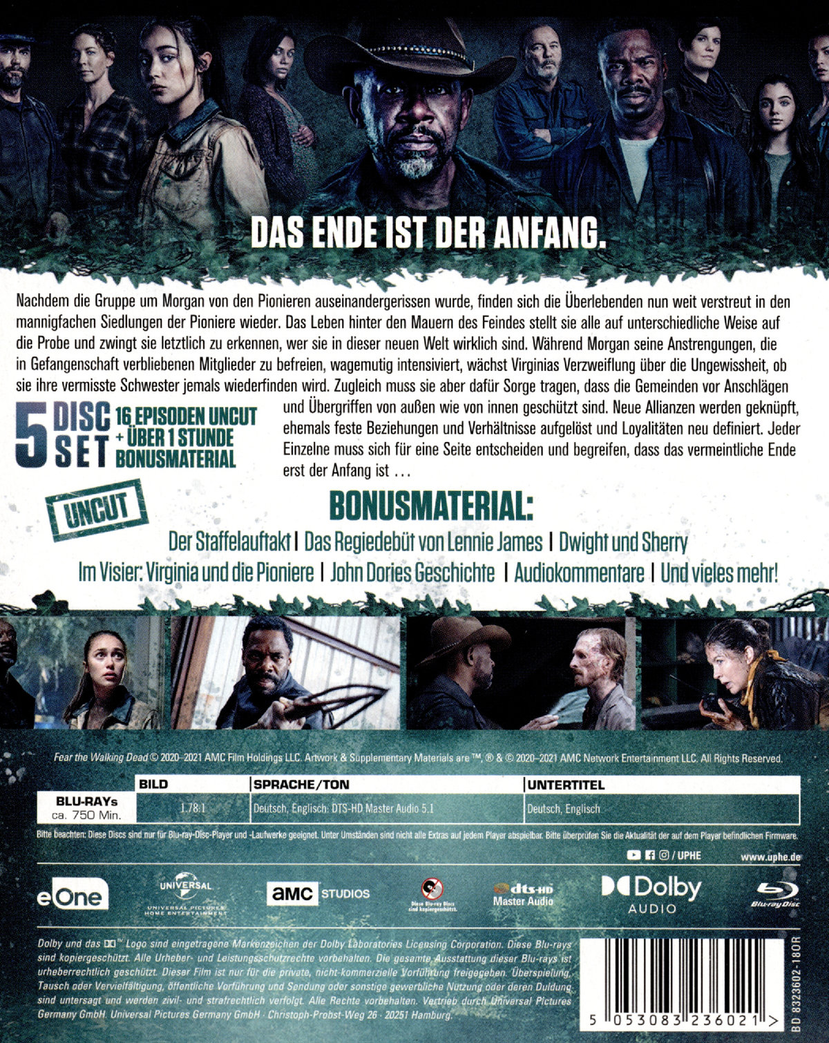 "Das Ende ist der Anfang" Nachdem die Gruppe um Morgan von den Pionieren auseinandergerissen wurde, finden sich die Überlebenden nun weit verstreut in den mannigfachen Siedlungen der Pioniere wieder. Das Leben hinter den Mauern des Feindes stellt sie alle auf unterschiedliche Weise auf die Probe und zwingt sie letztlich zu erkennen, wer sie in dieser neuen Welt wirklich sind. Während Morgan seine Anstrengungen, die in Gefangenschaft verbliebenen Mitglieder zu befreien, wagemutig intensiviert, wächst Virginias Verzweiflung über die Ungewissheit, ob sie ihre vermisste Schwester jemals wiederfinden wird. Zugleich muss sie aber dafür Sorge tragen, dass die Gemeinden vor Anschlägen und Übergriffen von außen wie von innen geschützt sind. Neue Allianzen werden geknüpft, ehemals feste Beziehungen und Verhältnisse aufgelöst und Loyalitäten neu definiert. Jeder Einzelne muss sich für eine Seite entscheiden und begreifen, dass das vermeintliche Ende erst der Anfang ist … Alle 16 Episoden uncut der sechsten Staffel auf 5 Discs. Episodenübersicht: - Das Ende ist der Anfang - Willkommen im Club - Alaska - Der Schlüssel - Honey - Begrabe sie neben Jaspers Bein - Eine ungewöhnliche Verbündete - Die Tür - Was noch zu tun bleibt - Handle With Care - Die Holding - In Dreams - J.D. - Mutter - USS Pennsylvania - Der Anfang