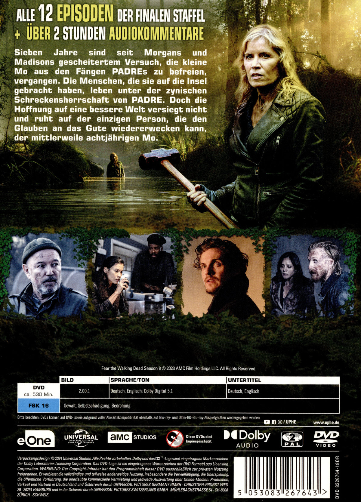 Sieben Jahre sind seit Morgans und Madisons gescheitertem Versuch, die kleine Mo aus den Fängen PADREs zu befreien, vergangen. Die Menschen, die sie auf die Insel gebracht haben, leben unter der zynischen Schreckensherrschaft von PADRE. Doch die Hoffnung auf eine bessere Welt versiegt nicht und beruht auf der einzigen Person, die den Glauben an das Gute wieder entfachen kann: die mittlerweile 8-jährige Mo.12 Episoden der achten Staffel auf 3 Discs + über 2 Stunden AudiokommentareEpisodenübersicht- Vergiss nicht, was dir weggenommen wurde- Das Experiment - Odessa- King County- Mehr Zeit als du ahnst- Ich sehe nur noch rot- Anton- Ein tödlicher Deal- Zuflucht- Halte sie am Leben- Ich kämpfe wie du- Der Weg nach vorn