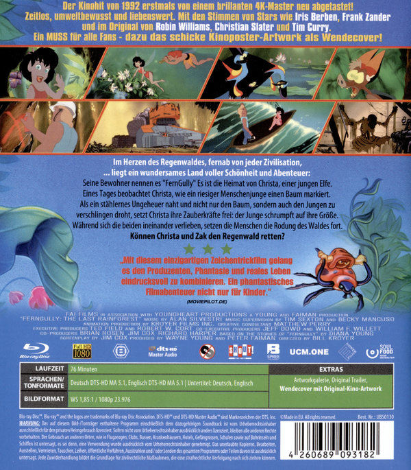 Nach langer Zeit endlich wieder erhältlich und so schön wie noch nie! Der Kinohit von 1992 erstmals von einem brillanten 4K-Master neu abgetastet auf DVD & Blu-ray und mit dem deutschen Kinoposter als alternatives Wendecover! Zeitlos, umweltbewusst und liebenswert ist dieser berühmte Animationsfilm im Stil von WATERSHIP DOWN - UNTEN AM FLUSS mit den Stimmen von vielen deutschen Stars (u.a. Frank Zander, Iris Berben) und im Original gesprochen von Weltstars wie Robin Williams oder Tim Curry ein MUSS für alle Fans! Ein fantastisches Erlebnis für Groß und Klein und besonders passend in der heutigen Zeit!