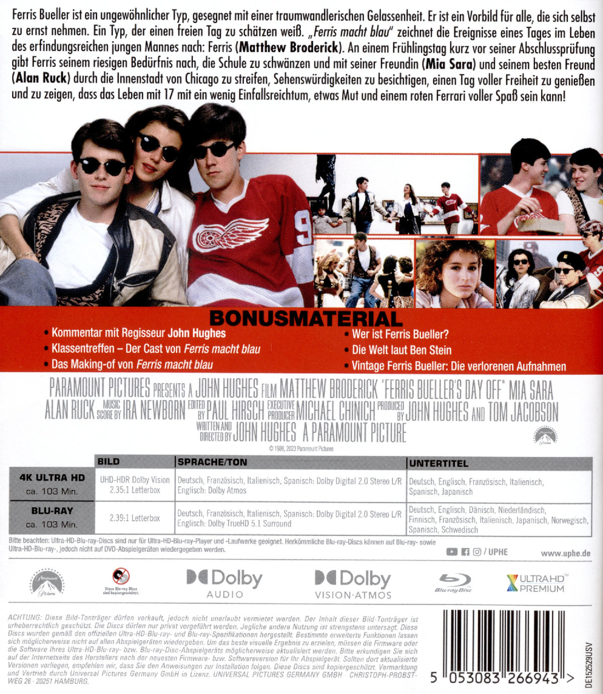 Enthält 4K UHD & Blu-ray,Kommentar mit Regisseur John Hughes,Klassentreffen - Der Cast von "Ferris macht blau",Making of,Wer ist Ferris Bueller?,Die Welt laut Ben Stein,Vintage Ferris Bueller: Die verlorenen Aufnahmen