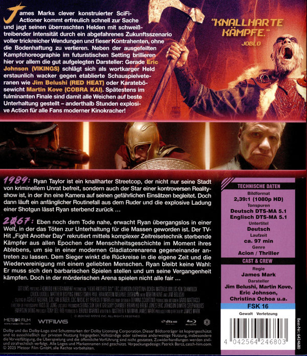 1989: Ryan Taylor ist ein knallharter Streetcop, der nicht nur seine Stadt von kriminellem Unrat befreit, sondern auch der Star einer kontroversen Realityshow ist, in der ihn eine Kamera auf seinen gefährlichen Einsätzen begleitet. Doch dann läuft ein anfänglicher Routinefall aus dem Ruder und die explosive Ladung einer Shotgun lässt Ryan sterbend zurück … 2067: Eben noch dem Tode nahe, erwacht Ryan übergangslos in einer Welt, in der das Töten zur Unterhaltung für die Massen geworden ist. Der TV-Hit „Fight Another Day“ rekrutiert mittels komplexer Zeitreisetechnik sterbende Kämpfer aus allen Epochen der Menschheitsgeschichte im Moment ihres Ablebens, um sie in einer modernen Gladiatorenarena gegeneinander antreten zu lassen. Dem Sieger winkt die Rückreise in die eigene Zeit und die Wiedervereinigung mit einem geliebten Menschen. Ryan bleibt keine Wahl: Er muss sich den barbarischen Spielen stellen und um seine Vergangenheit kämpfen. Doch in der mörderischen Arena spielen nicht alle fair … James Marks clever konstruierter SciFi-Actioner kommt erfreulich schnell zur Sache und jagt seinen überraschten Helden mit schweißtreibender Intensität durch ein abgefahrenes Zukunftsszenario voller trickreicher Wendungen und fieser Kontrahenten, ohne die Bodenhaftung zu verlieren. Neben der ausgefeilten Kampfchoreographie im futuristischen Setting brillieren hier vor allem die gut aufgelegten Darsteller: Gerade Eric Johnson (VIKINGS) schlägt sich als wortkarger Held erstaunlich wacker gegen etablierte Schauspielveteranen wie Jim Belushi (RED HEAT) oder Karatebösewicht Martin Kove (COBRA KAI). Spätestens im fulminanten Finale sind damit alle Weichen auf beste Unterhaltung gestellt – anderthalb Stunden explosive Action für alle Fans moderner Kinokracher!