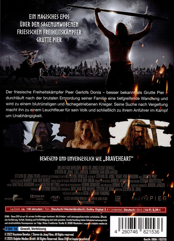 Der friesische Freiheitskämpfer Peer Gerlofs Donia besser bekannt als Grutte Pier, ist ein sanfter Riese, der nach dem Mord an seiner Familie zu einem blutrünstigen und rachegetriebenen Krieger wird. Seine Suche nach Vergeltung macht ihn zu einem Leuchtfeuer für sein Volk – und schließlich zu ihrem Anführer im Kampf um Unabhängigkeit. Dieses mythische Epos ist mehr als nur eine Biografie. Es ist eine Ode an Fryslân, ein Land, das für seine Freiheit kämpfte und noch immer kämpft. Fight for Freedom beleuchtet, wie ein guter, gutherziger Mann zu einem bösen Monster werden kann und wie diese Energie in einem unerbittlichen Streben nach Freiheit transformiert wird. Die packende Erzählung über Verrat, Loyalität und den Drang nach Freiheit zeigt den Aufstieg und Fall eines der bekanntesten Freiheitskämpfer der niederländischen Geschichte.
