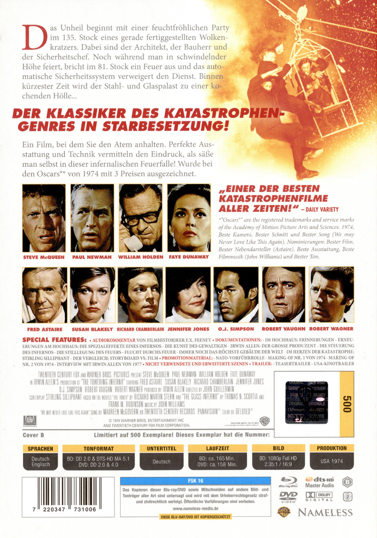 Audiokommentar von Filmhistoriker F.X. Feeney; Promotionmaterial: NATO-Vorführrolle, Making ofs, Interview mit Irwin Allen von 1977; Dokumentationen: Im Hochhaus - Erinnerungen, Erneuerungen am Hochhaus - Die Spezialeffekte eines Infernos, Die Kunst des Gewaltigen, Irwin Allen - Der grosse Produzent, Die Steuerung des Infernos, Die Stilllegung des Feuers, Flucht durchs Feuer, Immer noch das höchste Gebäude der Welt, Im Herzen der Katastrophe - Stirling Silliphant, Der Vergleich Storyboard vs. Film; Nicht verwendete und erweiterte Szenen; Teasertrailer; USA-Kinotrailer;