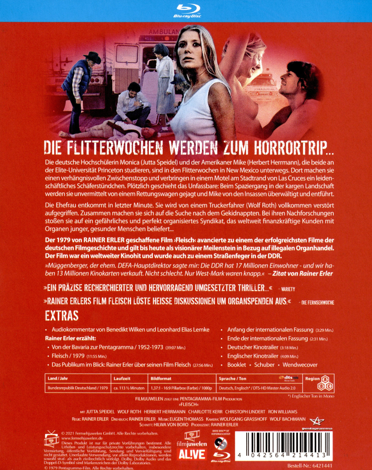 Booklet; Schuber; Wendecover;Rainer Erler erzählt: "Von der Bavaria zur Pentagramma" / 1952-1973 (ca. 39 Min.); Rainer Erler erzählt: "Fleisch" / 1979 (ca. 10 Min.); Interview mit Rainer Erler über "Fleisch" (ca. 28 Min.); Trailer;