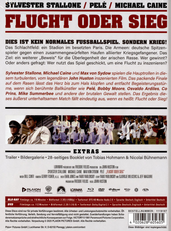 Ein Fußballmatch auf Leben und Tod – die unglaubliche Geschichte basiert auf wahren Begebenheiten des zweiten Weltkriegs. Regielegende John Huston (DIE SPUR DES FALKEN) setzt die Story mit einem grandiosen Ensemble um: Neben Oscar®-Preisträger Michael Caine und ROCKY-Star Sylvester Stallone bringt der Film eine Vielzahl wahrer Fußball-Legenden vor die Kamera, unter Anderen Pelé und Bobby Moore. Ein spannendes Kriegsdrama, das sich kein Fußballfan entgehen lassen darf!