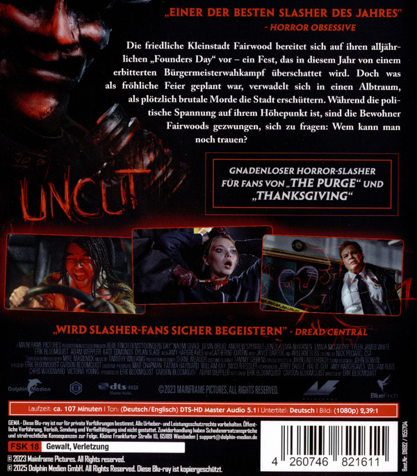 Die friedliche Kleinstadt Fairwood bereitet sich auf ihren alljährlichen „Founders Day“ vor – ein Fest, das in diesem Jahr von einem erbitterten Bürgermeisterwahlkampf überschattet wird. Doch was als fröhliche Feier geplant war, verwandelt sich in einen Albtraum, als plötzlich brutale Morde die Stadt erschüttern. Während die politische Spannung auf ihrem Höhepunkt ist, sind die Bewohner Fairwoods gezwungen, sich zu fragen: Wem kann man noch trauen, wenn alle Verdächtige sind? Founders Day ist ein fesselnder politischer Slasher, der auf clevere Weise die Spannung klassischer Horrorfilme mit scharfer Satire zu aktuellen politischen Themen kombiniert. Was den Film besonders macht, ist die Mischung aus schwarzem Humor und blutigen Morden, die gleichzeitig eine bissige Kritik an Machtstrukturen und politischer Korruption übt. Die jahrelange Entwicklung des Films, die ursprünglich in einem College-Wohnheim begann, verleiht ihm eine Authentizität und Leidenschaft, die sich in der gesamten Erzählung widerspiegeln. Founders Day ist mehr als nur ein Horrorfilm – es ist eine düstere Reflexion über Angst, Macht und menschliche Abgründe.