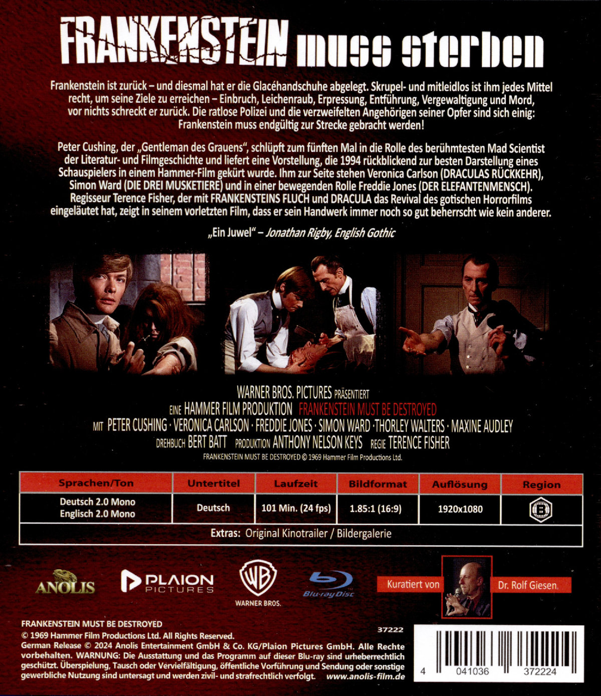 Frankenstein ist zurück – und diesmal hat er die Glacéhandschuhe abgelegt. Skrupel- und mitleidlos ist ihm jedes Mittel recht, um seine Ziele zu erreichen – Einbruch, Leichenraub, Erpressung, Entführung, Vergewaltigung und Mord, vor nichts schreckt er zurück. Die ratlose Polizei und die verzweifelten Angehörigen seiner Opfer sind sich einig: Frankenstein muss endgültig zur Strecke gebracht werden! Peter Cushing, der „Gentleman des Grauens“, schlüpft zum fünften Mal in die Rolle des berühmtesten Mad Scientist der Literatur- und Filmgeschichte und liefert eine Vorstellung, die 1994 rückblickend zur besten Darstellung eines Schauspielers in einem Hammer-Film gekürt wurde. Ihm zur Seite stehen Veronica Carlson (DRACULAS RÜCKKEHR), Simon Ward (DIE DREI MUSKETIERE) und in einer bewegenden Rolle Freddie Jones (DER ELEFANTENMENSCH). Regisseur Terence Fisher, der mit FRANKENSTEINS FLUCH und DRACULA das Revival des gotischen Horrorfilms eingeläutet hat, zeigt in seinem vorletzten Film, dass er sein Handwerk immer noch so gut beherrscht wie kein anderer.