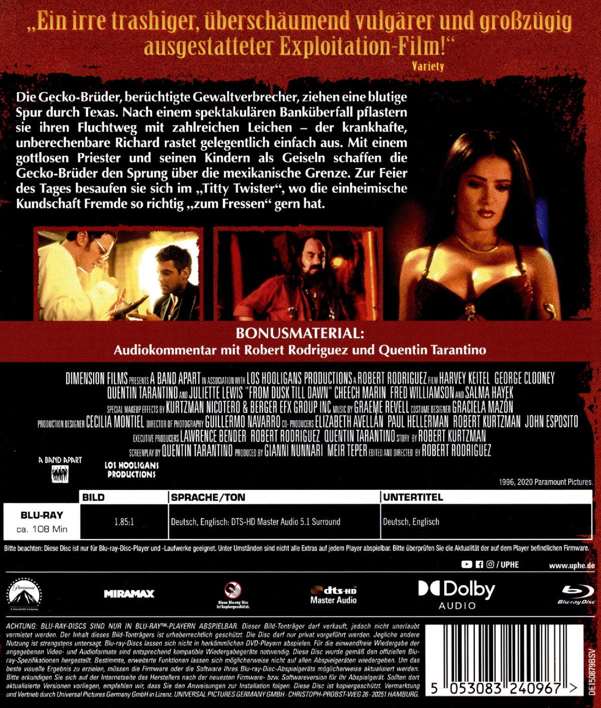 "Ein irre trashiger, überschäumend vulgärer und großzügig ausgestatteter Exploitation-Film!" (Variety)Die Gecko-Brüder, berüchtigte Gewaltverbrecher, ziehen eine blutige Spur durch Texas. Nach einem spektakulären Banküberfall pflastern sie ihren Fluchtweg mit zahlreichen Leichen - der krankhafte, unberechenbare Richard rastet gelegentlich einfach aus.Mit einem gottlosen Priester und seinen Kindern als Geiseln schaffen die Gecko-Brüder den Sprung über die mexikanische Grenze. Zur Feier des Tages besaufen sie sich im "Titty Twister", wo die einheimische Kundschaft Fremde so richtig "zum Fressen" gern hat.