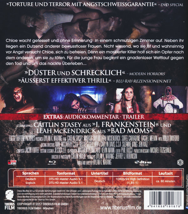Chloe wacht gefesselt und ohne Erinnerung in einem schmutzigen Zimmer auf. Neben ihr liegen ein Dutzend anderer bewusstloser Frauen. Nicht wissend, wo sie ist und wahnsinnig vor Angst versucht Chloe, sich zu befreien. Denn ein maskierter Killer holt sich ein Opfer nach dem anderen, um sie zu töten. Für die junge Frau beginnt ein gnadenloser Wettlauf gegen den Tod und um das nackte Überleben….