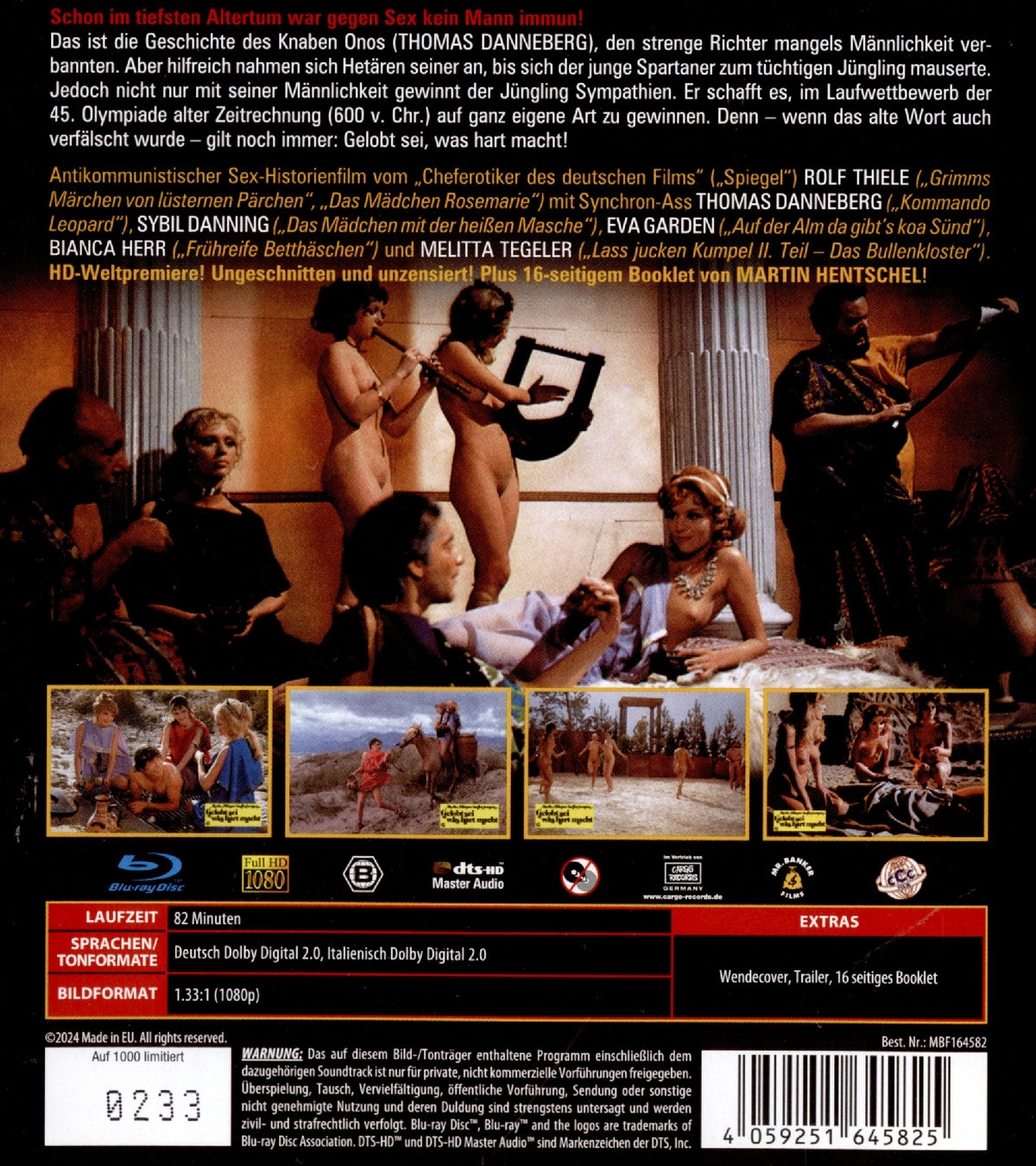 Schon im tiefsten Altertum war gegen Sex kein Mann immun! Das ist die Geschichte des Knaben Onos (THOMAS DANNEBERG), den strenge Richter mangels Männlichkeit verbannten. Aber hilfreich nahmen sich Hetären seiner an, bis sich der junge Spartaner zum tüchtigen Jüngling mauserte. Jedoch nicht nur mit seiner Männlichkeit gewinnt der Jüngling Sympathien. Er schafft es, im Laufwettbewerb der 45. Olympiade alter Zeitrechnung (600 v. Chr.) auf ganz eigene Art zu gewinnen. Denn - wenn das alte Wort auch verfälscht wurde - gilt noch immer: Gelobt sei, was hart macht! Antikommunistischer Sex-Historienfilm vom "Cheferotiker des deutschen Films" ("Spiegel") ROLF THIELE ("Grimms Märchen von lüsternen Pärchen", "Das Mädchen Rosemarie") mit Synchron-Ass THOMAS DANNEBERG ("Kommando Leopard"), SYBIL DANNING ("Das Mädchen mit der heißen Masche"), EVA GARDEN ("Auf der Alm da gibt's koa Sünd"), BIANCA HERR ("Frühreife Betthäschen") und MELITTA TEGELER ("Lass jucken Kumpel II. Teil - Das Bullenkloster"). HD-Weltpremiere! Ungeschnitten und unzensiert! Plus 16-seitiges Booklet!