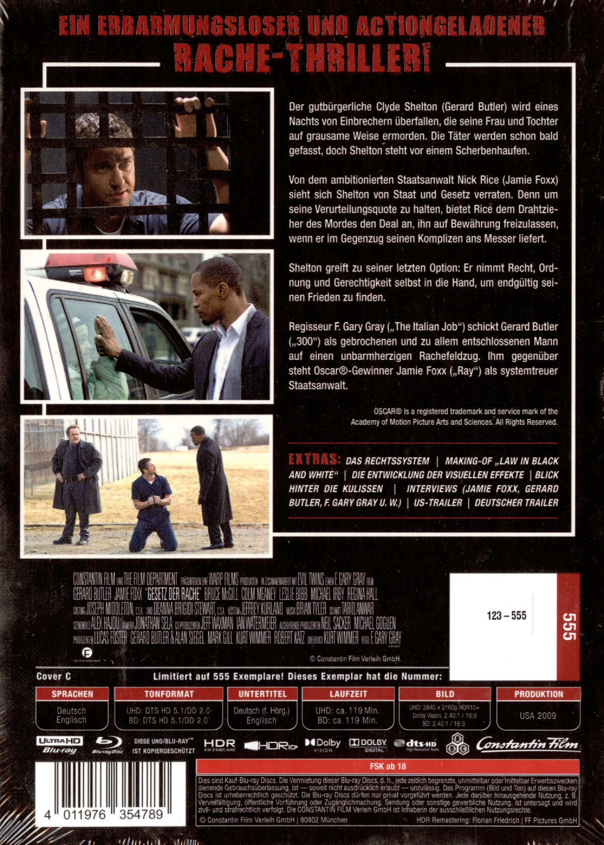 Ein Mann, der alles verloren hat, ist zu allem fähig! Der gutbürgerliche Clyde Shelton (Gerard Butler) wird eines Nachts von Einbrechern überfallen, die seine Frau und Tochter auf grausame Weise ermorden. Die Täter werden schon bald gefasst, doch Shelton steht vor einem Scherbenhaufen. Von dem ambitionierten Staatsanwalt Nick Rice (Jamie Foxx) sieht sich Shelton von Staat und Gesetz verraten. Denn um seine Verurteilungsquote zu halten, bietet Rice dem Drahtzieher des Mordes den Deal an, ihn auf Bewährung freizulassen, wenn er im Gegenzug seinen Komplizen ans Messer liefert. Shelton greift zu seiner letzten Option: Er nimmt Recht, Ordnung und Gerechtigkeit selbst in die Hand, um endgültig seinen Frieden zu finden. Der Director's Cut ist ca. 10 Minuten länger als die bisherige Version!