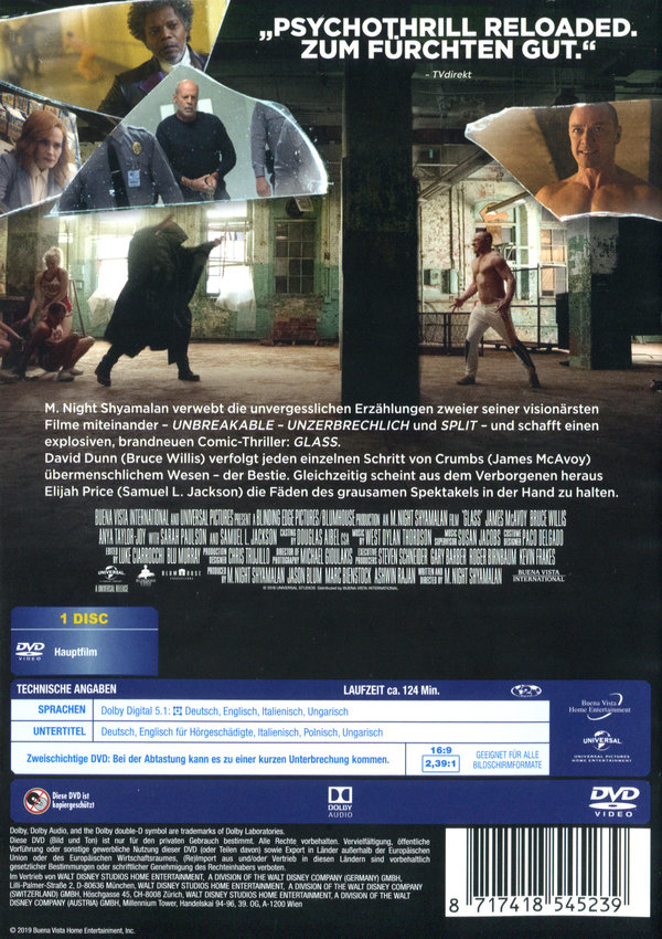 „Split“ war noch lange nicht das Ende. In GLASS verfolgt David Dunn (Bruce Willis) jeden einzelnen Schritt von Crumbs (James McAvoy) u¨bermenschlichen Wesen – dem Biest. Dabei drohen die Zusammensto¨ße von Gejagtem und Ja¨ger immer weiter zu eskalieren. Gleichzeitig scheint aus dem Verborgenen heraus Elijah Price (Samuel L. Jackson) die Fa¨den des grausamen Spektakels in der Hand zu halten. Zudem verbirgt er Geheimnisse, die Dunn und Crumb zum Verha¨ngnis werden ko¨nnten...