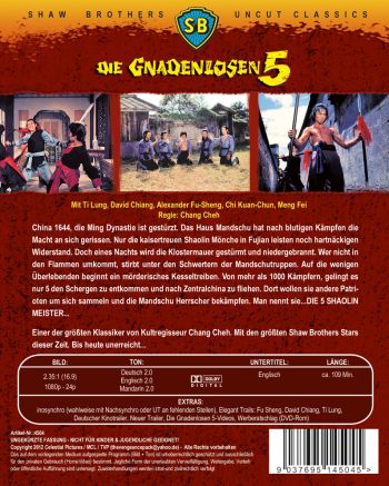 Die heldenhaften Mönche des Shaolin-Klosters sind ob ihrer kämpferischen Fähigkeiten überall gefürchtet. Darum gibt der grausame Qing-Kaiser den Manchus den Befehl, dieses Kloster niederzubrennen. ln einem Meer von Flammen werden fast alle Bewohner getötet, die wenigen Überlebenden in alle Winde zerstreut. Fünf der Tapferen, die sich retten konnten, entfliehen nach Zentralchina, wo sie sofort die Qing-Gegner um sich sammeln. Doch es gibt einen Verräter, der in Wahrheit dem Feind gehorcht...