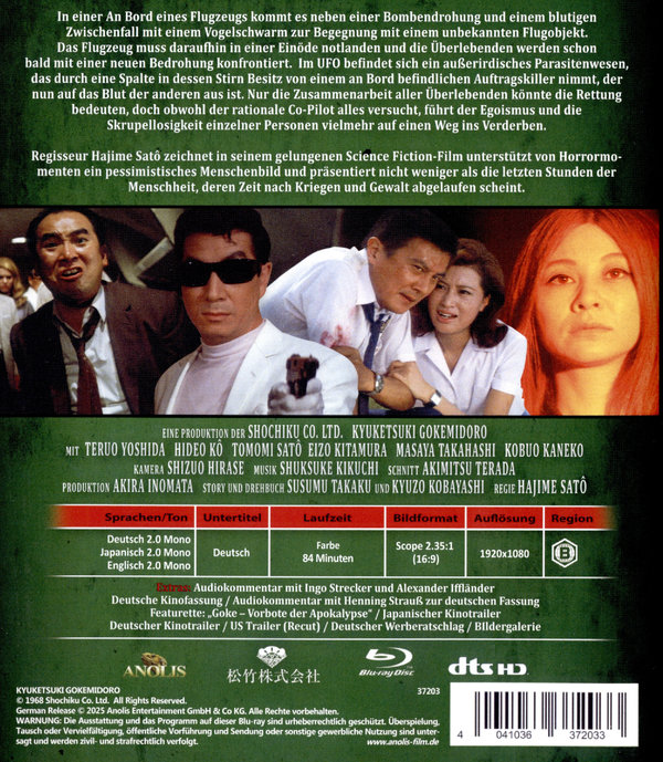 An Bord eines Flugzeugs kommt es neben einer Bombendrohung und einem blutigen Zwischenfall mit einem Vogelschwarm zur Begegnung mit einem unbekannten Flugobjekt. Das Flugzeug muss daraufhin in einer Einöde notlanden und die Überlebenden werden schon bald mit einer neuen Bedrohung konfrontiert. Im UFO befindet sich ein außerirdisches Parasitenwesen, das durch eine Spalte in dessen Stirn Besitz von einem an Bord befindlichen Auftragskiller nimmt, der nun auf das Blut der anderen aus ist. Nur die Zusammenarbeit aller Überlebenden könnte die Rettung bedeuten, doch obwohl der rationale Co-Pilot alles versucht, führt der Egoismus und die Skrupellosigkeit einzelner Personen vielmehr auf einen Weg ins Verderben. Regisseur Hajime Satô zeichnet in seinem gelungenen Science Fiction-Film unterstützt von Horrormomenten ein pessimistisches Menschenbild und präsentiert nicht weniger als die letzten Stunden der Menschheit, deren Zeit nach Kriegen und Gewalt abgelaufen scheint.