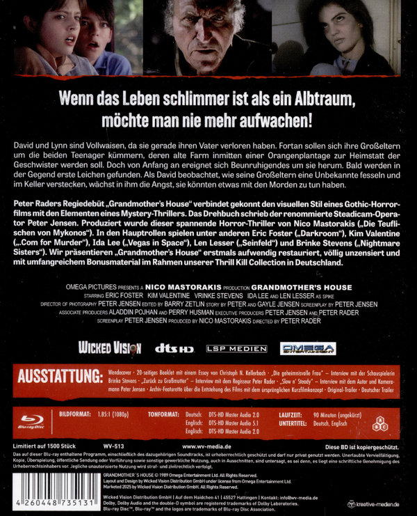 Peter Raders Regiedebüt „Grandmother’s House“ verbindet gekonnt den visuellen Stil eines Gothic-Horrorfilms mit den Elementen eines Mystery-Thrillers. Das Drehbuch schrieb der renommierte Steadicam-Operator Peter Jensen. Produziert wurde dieser spannende Horror-Thriller von Nico Mastorakis („Die Teuflischen von Mykonos“). In den Hauptrollen spielen unter anderen Eric Foster („Darkroom“), Kim Valentine („.Com for Murder“), Ida Lee („Vegas in Space“), Len Lesser („Seinfeld“) und Brinke Stevens („Nightmare Sisters“). Wir präsentieren „Grandmother’s House“ erstmals aufwendig restauriert, völlig unzensiert und mit umfangreichem Bonusmaterial im Rahmen unserer Thrill Kill Collection in Deutschland.