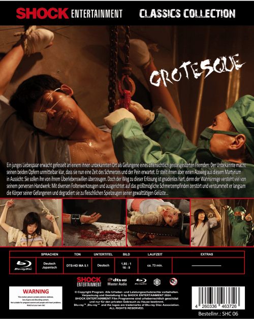 Fast 25 Jahre nach der berühmt-berüchtigten GUINEA PIG-Serie lässt Koji Shiraishi (CARVED) mit GROTESQUE einen noch brutaleren und unbarmherzigeren Skandalfilm auf die Menschheit los. Mit extrem realistischen Gore-Effekten und einer überzeugenden Besetzung an Schauspielern entwarf Shiraishi ein krank-perverses Kammerspiels, das sich mit seinen abartig brutalen Exzessen jenseits aller moralischen Grenzen bewegt. Gegen GROTESQUE wirken alle bisherigen Torture-Porn-Filme wie SAW oder HOSTEL wie Kleinkinder-Unterhaltung. Betrachten Sie dies nicht als Werbespruch, sondern als Warnung: GROTESQUE ist ausschließlich für allerstärkste Nervenkostüme geeignet!