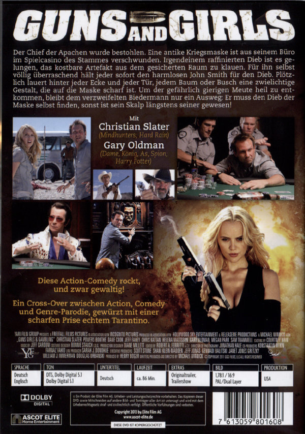 Der Chief der Apachen wurde bestohlen. Eine antike Kriegsmaske ist aus seinem Büro im Spielcasino des Stammes verschwunden. Irgendeinem raffinierten Dieb ist es gelungen, das kostbare Artefakt aus dem gesicherten Raum zu klauen. Für ihn selbst völlig überraschend hält jeder sofort den harmlosen John Smith für den Dieb. Plötzlich lauert hinter jeder Ecke und jeder Tür, jedem Baum oder Busch eine zwielichtige Gestalt, die auf die Maske scharf ist. Um der gefährlich gierigen Meute heil zu entkommen, bleibt dem verzweifelten Biedermann nur ein Ausweg: Er muss den Dieb der Maske selbst finden, sonst ist sein Skalp längstens seiner gewesen! Mit Guns, Girls & Gambling schickt Regisseur Michael Winnick eine abgefahrene Action-Comedy ins Rennen, die allein schon wegen des Auftritts von Gary Oldman als Elvis-Imitator denkwürdig ist. Hier sind alle Zutaten, die man für ein gelungenes Entertainment-Menü braucht, reichlich vorhanden. Skurrile Figuren, Sexappeal in den Kurven einer macho-coolen Blondine, die die jüngere Schwester von Kill Bills Elle Driver sein könnte, dämliche Indianer, noch dämlichere Sheriffs,