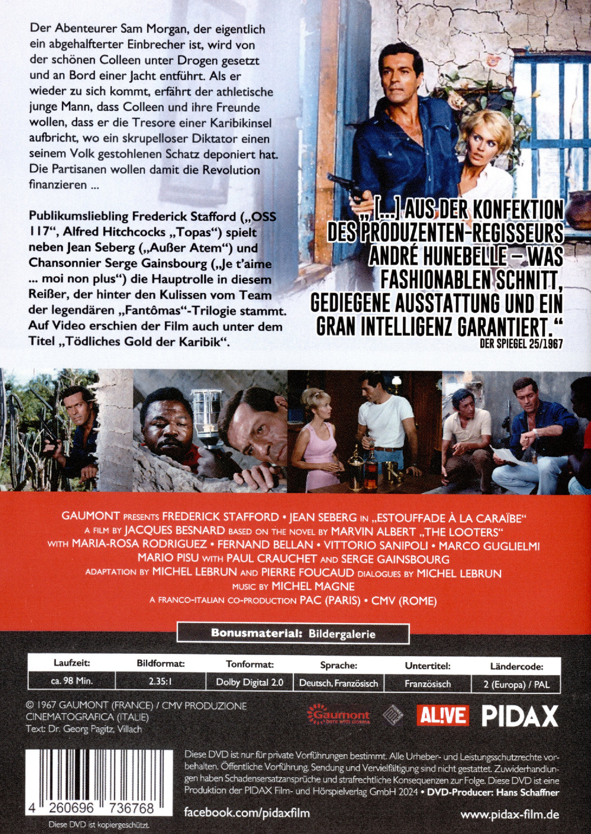 Der Abenteurer Sam Morgan, der eigentlich ein abgehalfterter Einbrecher ist, wird von der schönen Colleen unter Drogen gesetzt und an Bord einer Jacht entführt. Als er wieder zu sich kommt, erfährt der athletische junge Mann, dass Colleen und ihre Freunde wollen, dass er die Tresore einer Karibikinsel aufbricht, wo ein skrupelloser Diktator einen seinem Volk gestohlenen Schatz deponiert hat. Die Partisanen wollen damit die Revolution finanzieren ... Publikumsliebling Frederick Stafford („OSS 117“, Alfred Hitchcocks „Topas“) spielt neben Jean Seberg („Außer Atem“) und Chansonnier Serge Gainsbourg („Je t’aime ... moi non plus“) die Hauptrolle in diesem Reißer, der hinter den Kulissen vom Team der legendären „Fantômas“-Trilogie stammt. Auf Video erschien der Film auch unter dem Titel „Tödliches Gold der Karibik“.