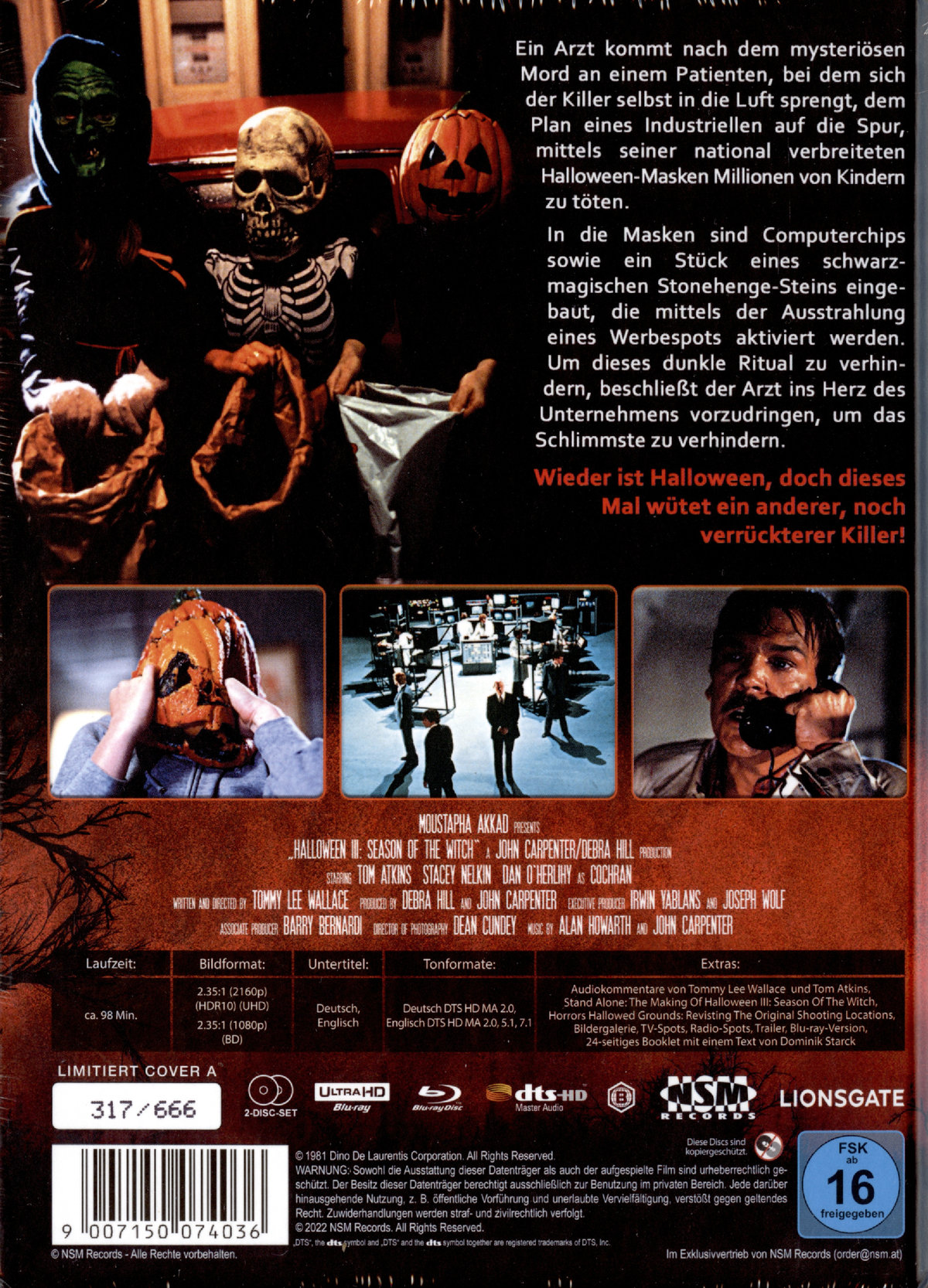 - 24-seitiges Booklet von Dominik Starck- Limitiertes und nummeriertes Mediabook- Audiokommentar mit Regisseur Tommy Lee Wallace- Audiokommentar mit Darsteller Tom Atkins- Stand Alone: The Making Of HALLOWEEN III: Season Of The Witch- Horror's Hallowed Grounds: Revisting The Original Shooting Locations- Bildergalerie- TV Spots- Radio Spots- Trailer- Blu-ray-Version