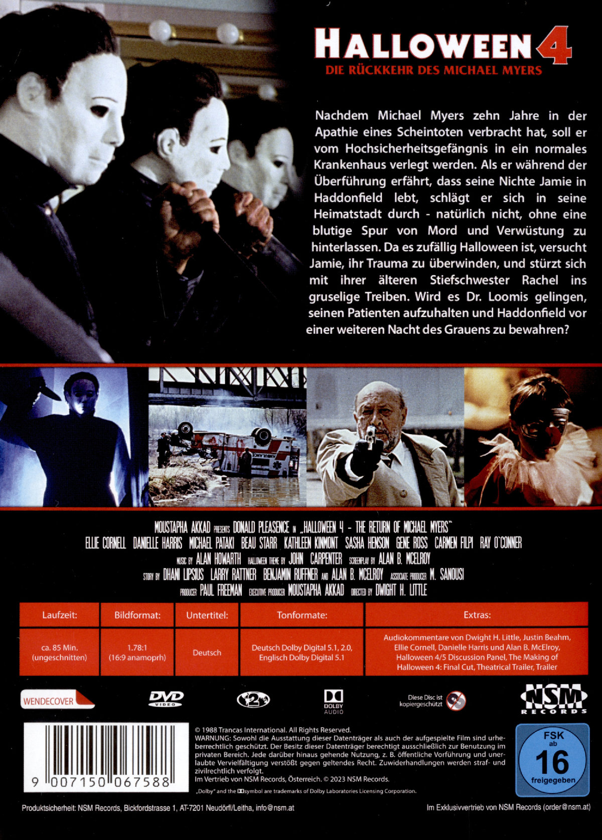 Audiokommentar mit Regisseur Dwight H. Little und Autor Justin Beahm; Audiokommentar mit den Schauspielern Ellie Cornell und Danielle Harris; Audiokommentar mit Alan B. McElroy. Halloween 4 / 5 Discussion Panel; Theatrical Trailer; Trailer Halloween 3-5