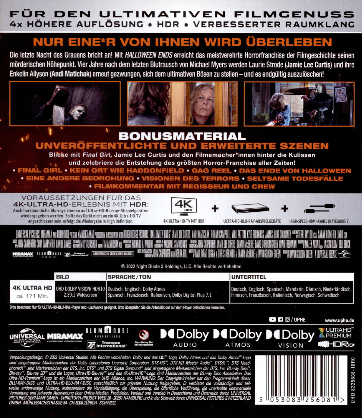 - Enthält nur 4K Ultra HD- Unveröffentlichte und erweiterte Szenen- Final Girl- Kein Ort wie Haddonfield- Gag Reel- Das Ende von "Halloween"- Eine andere Bedrohung- Visionen des Terrors- Seltsame Todesfälle- Filmkommentar mit Regisseur und Crew