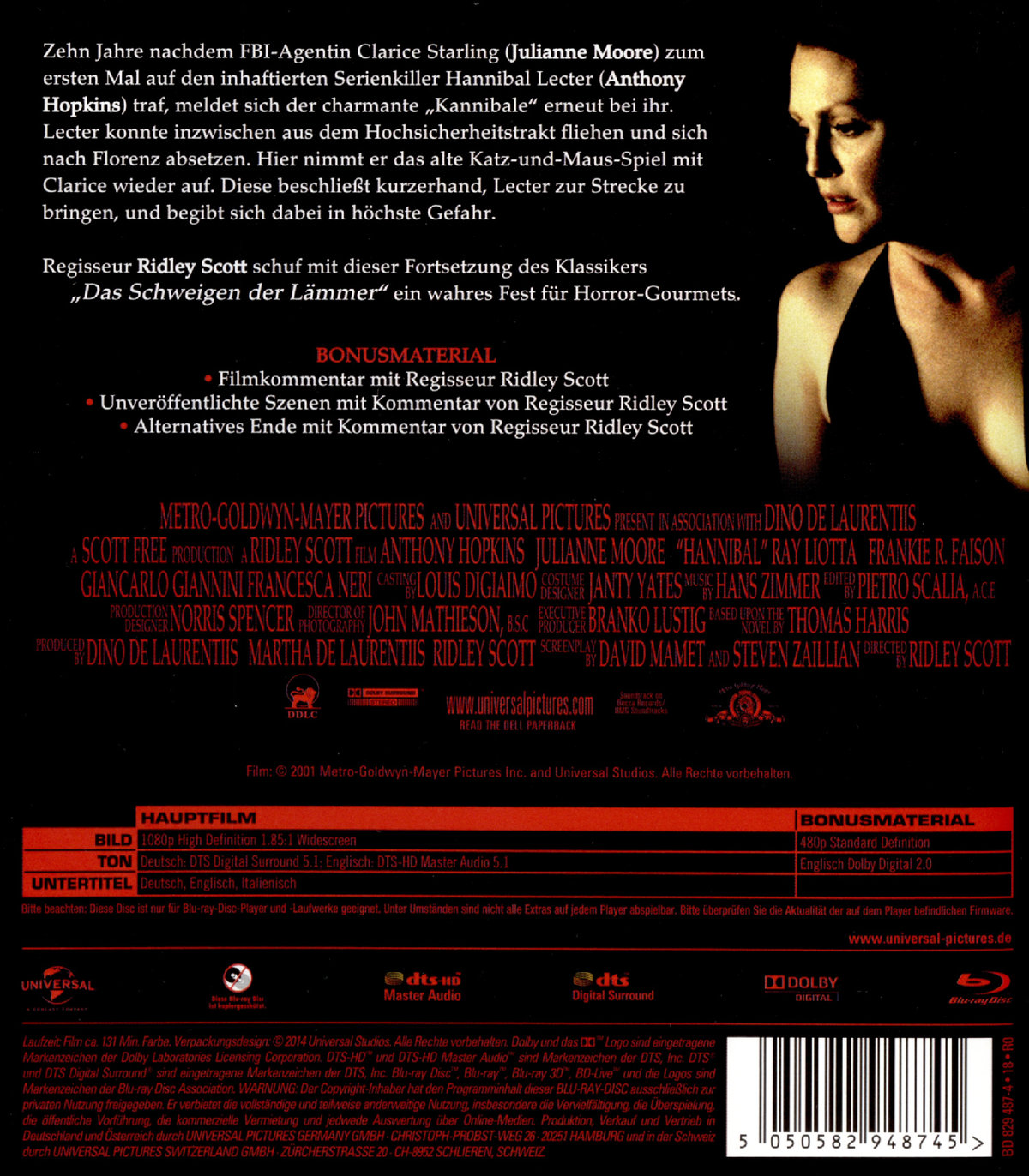 Zehn Jahre sind vergangen, seit Special Agent Clarice Starling sich auf nervenaufreibende Gespräche mit dem kannibalischen Psychiater Dr. Hannibal Lecter einließ, um den Serienmörder "Buffalo Bill" dingfest zu machen. Lecter gelang damals eine spektakuläre Flucht, und inzwischen hat er unter dem Namen Dr. Fell den Posten des Kurators der Palazzo-Capponi-Bibliothek im berühmten Palazzo Vecchio in Florenz ergattert. Aber seine ruhigen Tage sind gezählt. Längst ist nicht mehr nur das FBI hinter ihm her, sondern außerdem Mason Verger, Erbe eines gewaltigen Viehzucht-Imperiums und einziges überlebendes Opfer von Hannibal Lecter. Nun hat Verger ein immenses Kopfgeld auf seinen Peiniger ausgesetzt, das gierige Polizisten ebenso reizt wie korrupte Justizbeamte. Als Dr. Lecter sich mit einem Brief bei Clarice meldet und Verger davon erfährt, kommt dem entstellten Milliardär schließlich eine perfide Idee: Er will Lecter fangen, indem er Clarice als Köder einsetzt...