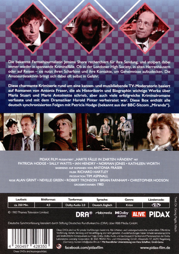 Diese charmante Krimiserie rund um eine katzen- und musikliebende TV Moderatorin basiert auf Romanen von Antonia Fraser, die als Historikerin und Biographin wichtige Werke über Maria Stuart und Marie Antoinette schrieb, aber auch viele erfolgreiche Kriminalromane verfasste und mit dem Dramatiker Harold Pinter verheiratet war. Diese Box enthält alle deutsch synchronisierten Folgen mit Patricia Hodge (bekannt aus der BBC-Sitcom „Miranda“).