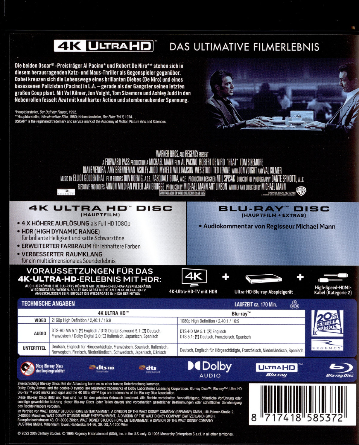 Die beiden Oscar®-Preisträger Al Pacino und Robert De Niro stehen sich in diesem herausragenden Katz- und Maus-Thriller als Gegenspieler gegenüber. Dabei kreuzen sich die Lebenswege eines brillanten Diebes (De Niro) und eines besessenen Polizisten (Pacino) in L.A. - gerade als der Gangster seinen letzten großen Coup plant. Mit Val Kilmer, Jon Voight, Tom Sizemore und Ashley Judd in den Nebenrollen fesselt "Heat" mit knallharter Action und atemberaubender Spannung.