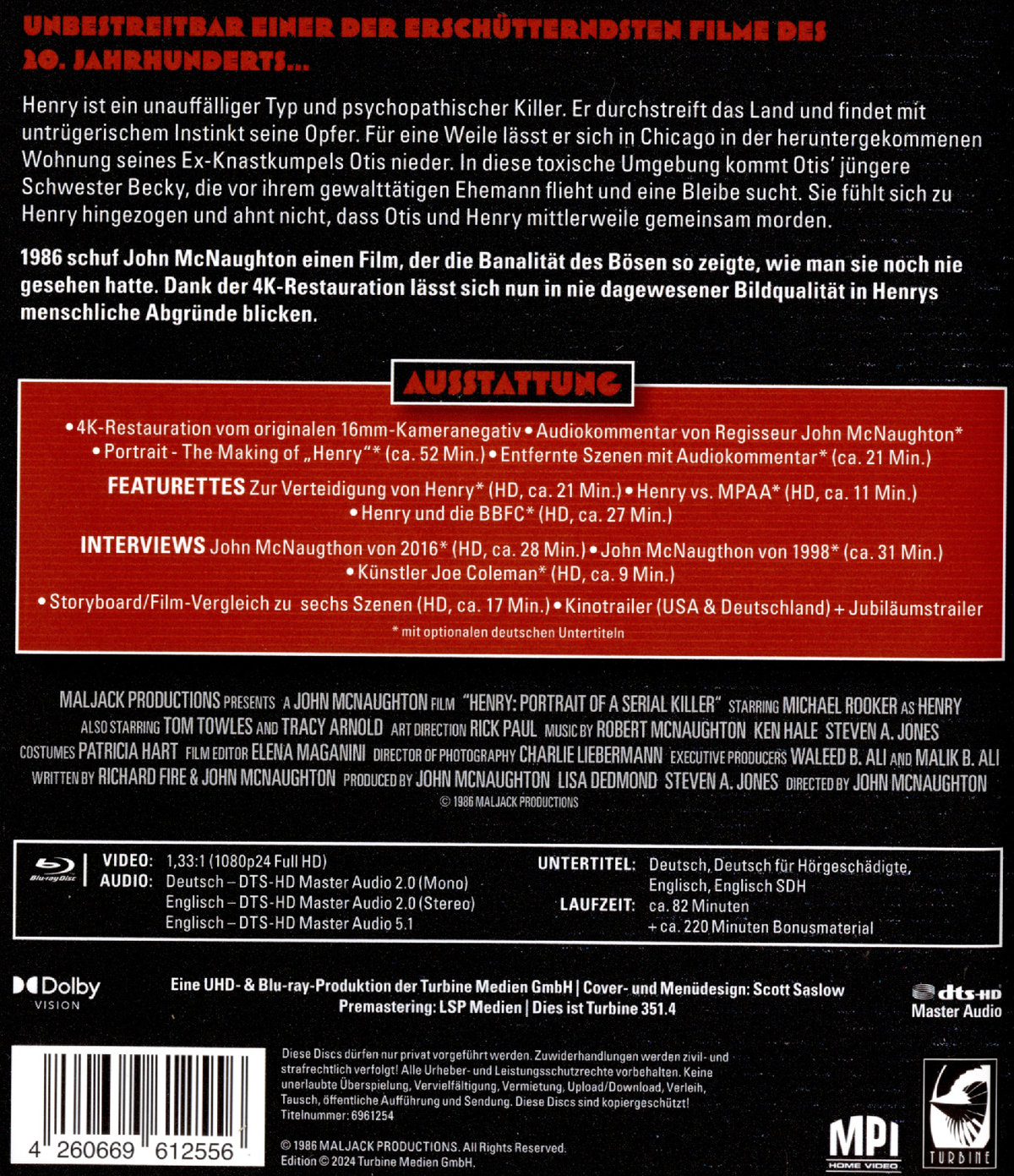 4K-Restauration vom originalen 16mm-Kameranegativ; Audiokommentar von Autor/Regisseur John McNaugthon*; Portrait – The Making of "Henry"* (ca. 52 Min.); Entfernte Szenen mit Audiokommentar* (ca. 21 Min.); Featurettes: Zur Verteidigung von Henry* (HD; ca. 21 Min.); Henry vs. MPAA* (HD; ca. 11 Min.); Henry und die BBFC* (HD; ca. 27 Min.); Interviews: John McNaugthon von 2016* (HD; ca. 28 Min.); John McNaugthon von 1998* (ca. 31 Min.); Künstler Joe Coleman* (HD; ca. 9 Min.); Storyboard/Film-Vergleich zu sechs Szenen (HD; ca. 17 Min.); Kinotrailer (USA & Deutschland) + Jubiläumstrailer* mit optionalen deutschen Untertiteln