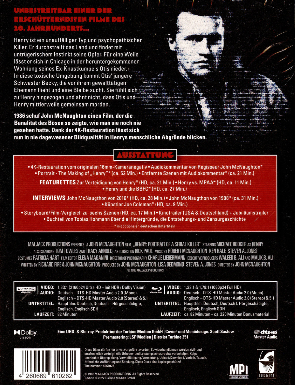 UHD4K-Restauration vom originalen 16mm-Kameranegativ; Audiokommentar von Autor/Regisseur John McNaugthon*; Portrait – The Making of "Henry"* (ca. 52 Min.); Entfernte Szenen mit Audiokommentar* (ca. 21 Min.); Featurettes "Zur Verteidigung von Henry"* (HD; ca. 21 Min.); "Henry vs. MPAA"* (HD; ca. 11 Min.); "Henry und die BBFC"* (HD; ca. 27 Min.); Interviews: John McNaugthon von 2016* (HD; ca. 28 Min.); John McNaugthon von 1998* (ca. 31 Min.); Künstler Joe Coleman* (HD; ca. 9 Min.); Storyboard/Film-Vergleich zu sechs Szenen (HD; ca. 17 Min.); Kinotrailer (USA & Deutschland) + Jubiläumstrailer; Buchteil von Tobias Hohmann über die Hintergründe; die Entstehungs; und Zensurgeschichte* mit optionalen deutschen UntertitelnBlu-ray4K-Restauration vom originalen 16mm-Kameranegativ; Audiokommentar von Autor/Regisseur John McNaugthon*; Portrait – The Making of "Henry"* (ca. 52 Min.); Entfernte Szenen mit Audiokommentar* (ca. 21 Min.); Featurettes "Zur Verteidigung von Henry"* (HD; ca. 21 Min.); "Henry vs. MPAA"* (HD; ca.