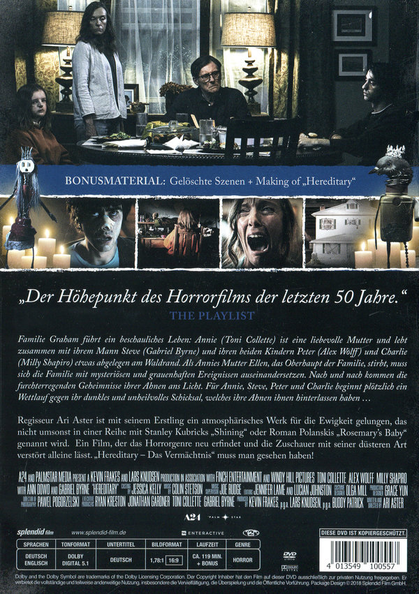 HEREDITARY - DAS VERMÄCHTNIS zieht bereits Horror-Fans auf der ganzen Welt in seinen Bann. Newcomer-Regisseur und Drehbuchautor Ari Aster ist ein spannender, atmosphärisch dichter und intelligenter Psycho-Horror-Thriller gelungen. Bereits auf dem diesjährigen Sundance Filmfestival sorgte er für Furore. Toni Collette („Unlocked“, „Madame“) beeindruckt mit ihrer Darstellung der verzweifelten und besessenen Mutter. An ihrer Seite spielen u.a. Gabriel Byrne („Lies We Tell“, „Mad to Be Normal“) als hilfloser Vater und Jungstar Alex Wolff („Jumanji: Willkommen im Dschungel“, „Boston“), der durch sein intensives Schauspiel überzeugt.