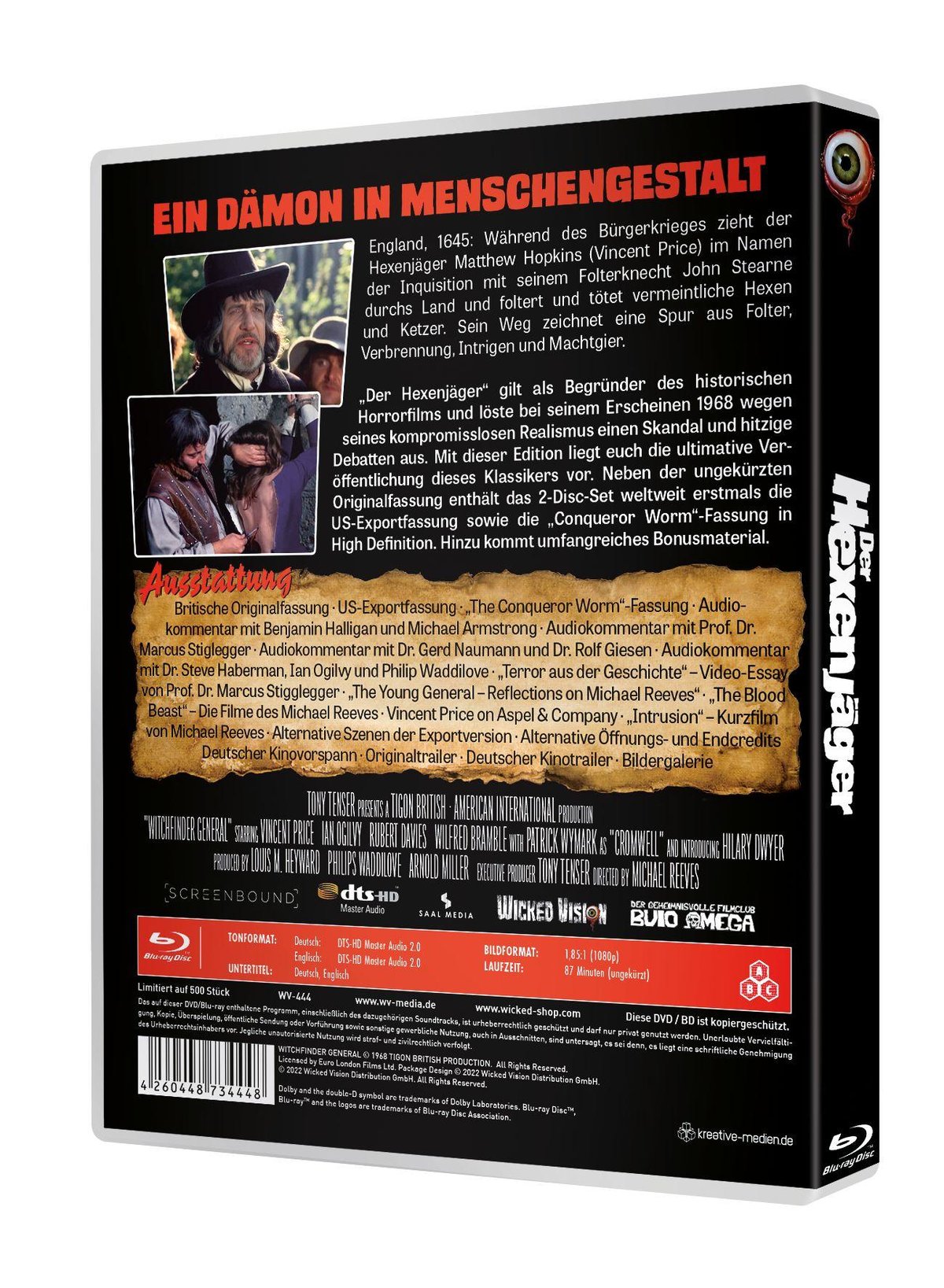„Der Hexenjäger“ gilt als Begründer des historischen Horrorfilms und löste bei seinem Erscheinen 1968 wegen seines kompromisslosen Realismus einen Skandal und hitzige Debatten aus. Mit dieser Edition liegt euch die ultimative Veröffentlichung dieses Klassikers vor. Neben der ungekürzten Originalfassung enthält das 2-Disc-Set weltweit erstmals die US-Exportfassung sowie die „Conqueror Worm“-Fassung in High Definition. Hinzu kommt umfangreiches Bonusmaterial.