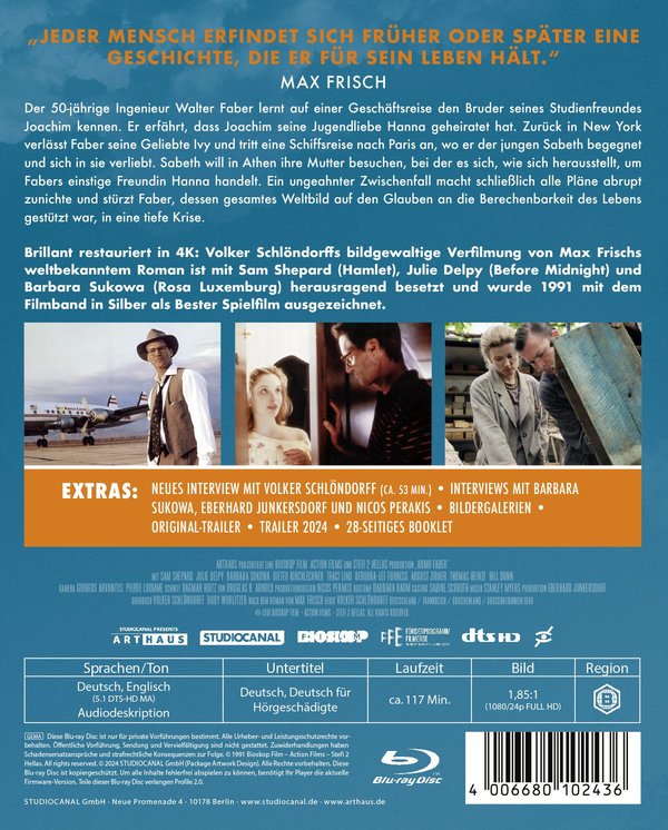 Volker Schlöndorffs bildgewaltige Verfilmung von Max Frischs weltbekanntem Roman ist mit Sam Shepard ("Der Stoff, aus dem die Helden sind"), Julie Delpy ("Die drei Musketiere") und Barbara Sukowa ("Rosa Luxemburg") herausragend besetzt und wurde 1991 mit dem Filmband in Silber als Bester Spielfilm ausgezeichnet. Von der Deutschen Film- und Medienbewertung in Wiesbaden erhielt HOMO FABER das Prädikat "besonders wertvoll".