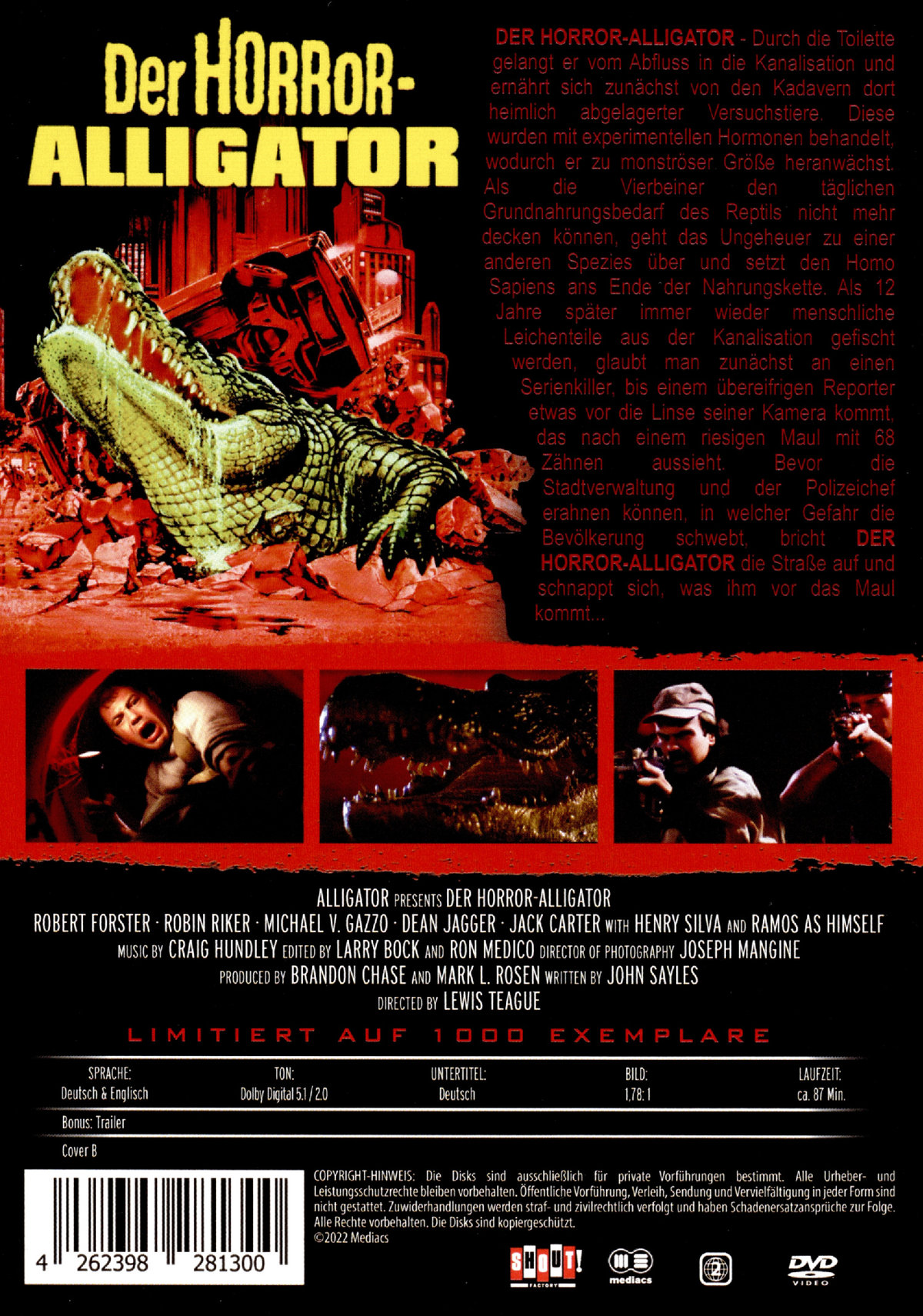 DER HORROR-ALLIGATOR - Durch die Toilette gelangt er vom Abfluss in die Kanalisation und ernährt sich zunächst von den Kadavern dort heimlich abgelagerter Versuchstiere. Diese wurden mit experimentellen Hormonen behandelt, wodurch er zu monströser Größe heranwächst. Als die Vierbeiner den täglichen Grundnahrungsbedarf des Reptils nicht mehr decken können, geht das Ungeheuer zu einer anderen Spezies über und setzt den Homo Sapiens ans Ende der Nahrungskette. Als 12 Jahre später immer wieder menschliche Leichenteile aus der Kanalisation gefischt werden, glaubt man zunächst an einen Serienkiller, bis einem übereifrigen Reporter etwas vor die Linse seiner Kamera kommt, das nach einem riesigen Maul mit 68 Zähnen aussieht. Bevor die Stadtverwaltung und der Polizeichef erahnen können, in welcher Gefahr die Bevölkerung schwebt, bricht DER HORROR-ALLIGATOR die Straße auf und schnappt sich, was ihm vor das Maul kommt...