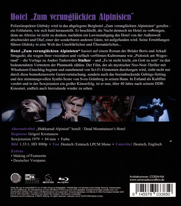 HOTEL „ZUM VERUNGLÜCKTEN ALPINISTEN“ basiert auf einem Roman der Brüder Boris und Arkadi Strugazki, die wegen ihrer visionären und vielfach verfilmten Kultromane wie „Picknick am Wegesrand“ – die Vorlage zu Andrei Tarkowskis STALKER – und ES IST NICHT LEICHT EIN GOTT ZU SEIN zu den bedeutendsten Vertretern der Phantastik zählen. Der Film, der als mystischer Neo-Noir-Thriller mit Whodunnit-Einschlag beginnt und zunehmend von Sci-Fi-Elementen durchzogen wird, zieht nicht nur durch diese bemerkenswerte Genrevermischung, sondern auch das beeindruckende Gebirgs-Setting und den stimmungsvollen Synthi-Score von Sven Grünberg in seinen Bann. In Estland als Kultfilm verehrt und in der Sowjetunion ein großer Kinoerfolg, ist er nun, über 40 Jahre nach seinem DDR-Kinostart, endlich auch hierzulande wieder zu sehen.