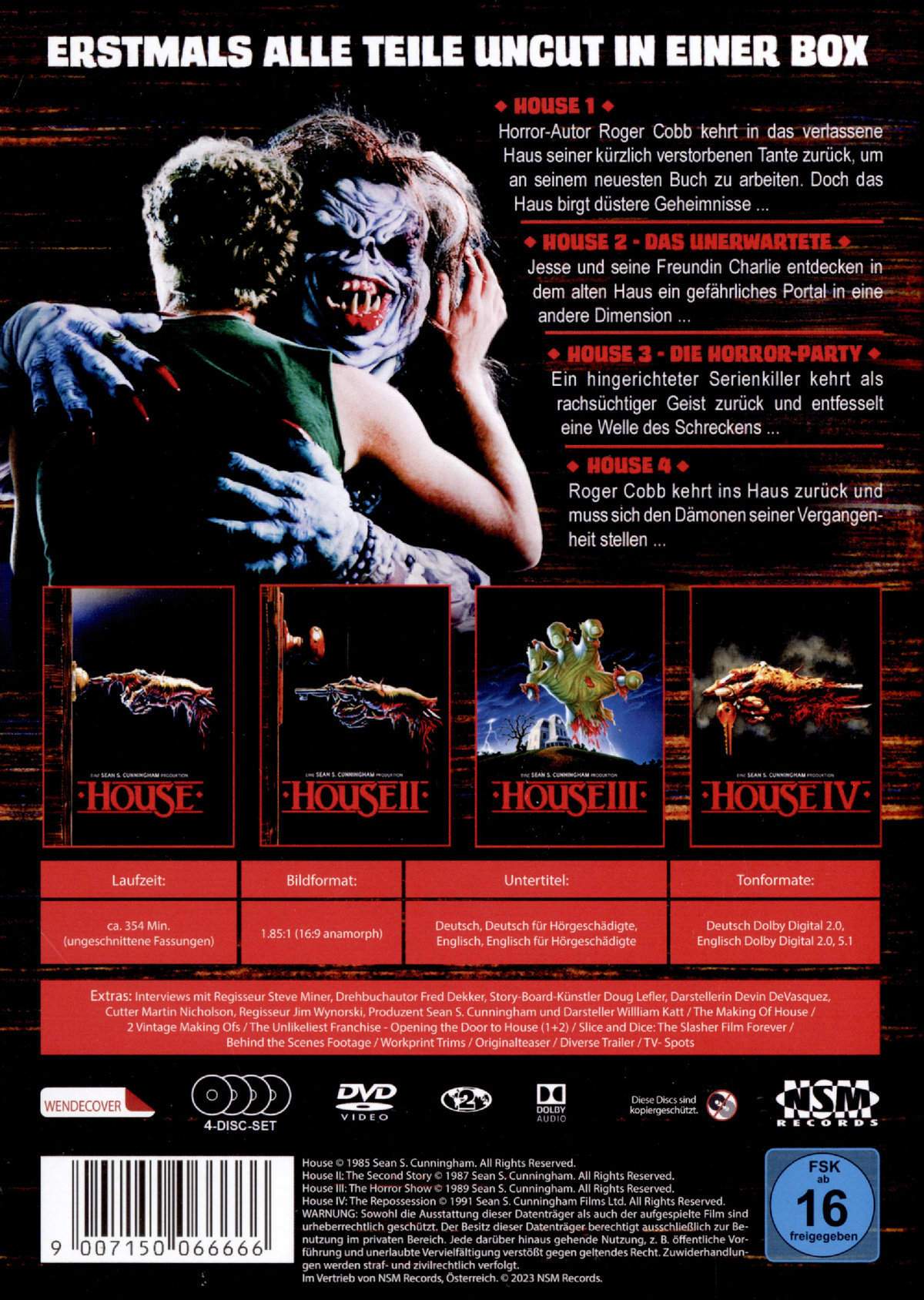 HOUSE 1; Interview mit Regisseur Steve Miner (Englisch mit optionalen deutschen & englischen Untertiteln); Interview mit Drehbuchautor Fred Dekker (Englisch mit optionalen deutschen & englischen Untertiteln); Interview mit Story-Board-Künstler Doug Lefler (Englisch mit optionalen deutschen & englischen Untertiteln); The Making Of House (Englisch mit optionalen deutschen & englischen Untertiteln); Vintage Making Of (Englisch mit optionalen deutschen & englischen Untertiteln); Originalteaser; Trailer 1; Trailer 2; TV; SpotsHOUSE 2; The Unlikeliest Franchise ; Opening The Door To House (1/2) (Englisch mit optionalen deutschen & englischen Untertiteln); Interview mit Darstellerin Devin Devasquez (Englisch mit optionalen deutschen & englischen Untertiteln); Interview mit Cutter Martin Nicholson (Englisch mit optionalen deutschen & englischen Untertiteln); Vintage Making Of (Englisch mit optionalen deutschen & englischen Untertiteln); DeutscherTrailer; Originaltrailer; TV; SpotHOUSE 3 ; Slice and Dice: The Slasher