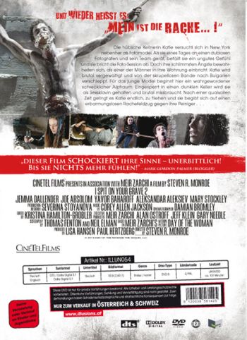 Die hübsche Kellnerin Katie versucht sich in New York nebenher als Fotomodel. Als sie an einen dubiosen Fotografen und sein Team gerät, befällt sie ein ungutes Gefühl und sie bricht die Foto-Session ab. Doch ihre Ängste bewahrheiten sich, als einer der Männer eines Nachts in ihr Haus eindringt und sie brutal vergewaltigt. Um die Tat zu vertuschen, verschleppen er und die anderen Männer Katie nach Bulgarien. Eingesperrt in einem dunklen Keller wird sie als Sexsklave missbraucht. Doch Katie kann eines Tages flüchten und schwört grausame Rache an ihren Peinigern, die keiner von ihnen überleben wird... Der Originalfilm des legendären Rape & Revenge-Movies von Meir Zarchi aus dem Jahre 1978 erschien unter gleichnamigem Titel und wurde aufgrund seiner expliziten Gewaltdarstellung in zahlreichen Ländern beschlagnahmt. 2010 sorgte das spektakuläre Remake von I SPIT ON YOUR GRAVE mit Sarah Butler erneut für internationale Entrüstung. Auch die Fortsetzung des ultraharten Kult-Rache-Thrillers wurde von Steven R. Monroe in Szene gesetzt, mit Supermodel Jemma Dallender ("Community"), Joe Absolom und Yavor Baharov ("Faith", "Love and Whiskey") in den Hauptrollen. .