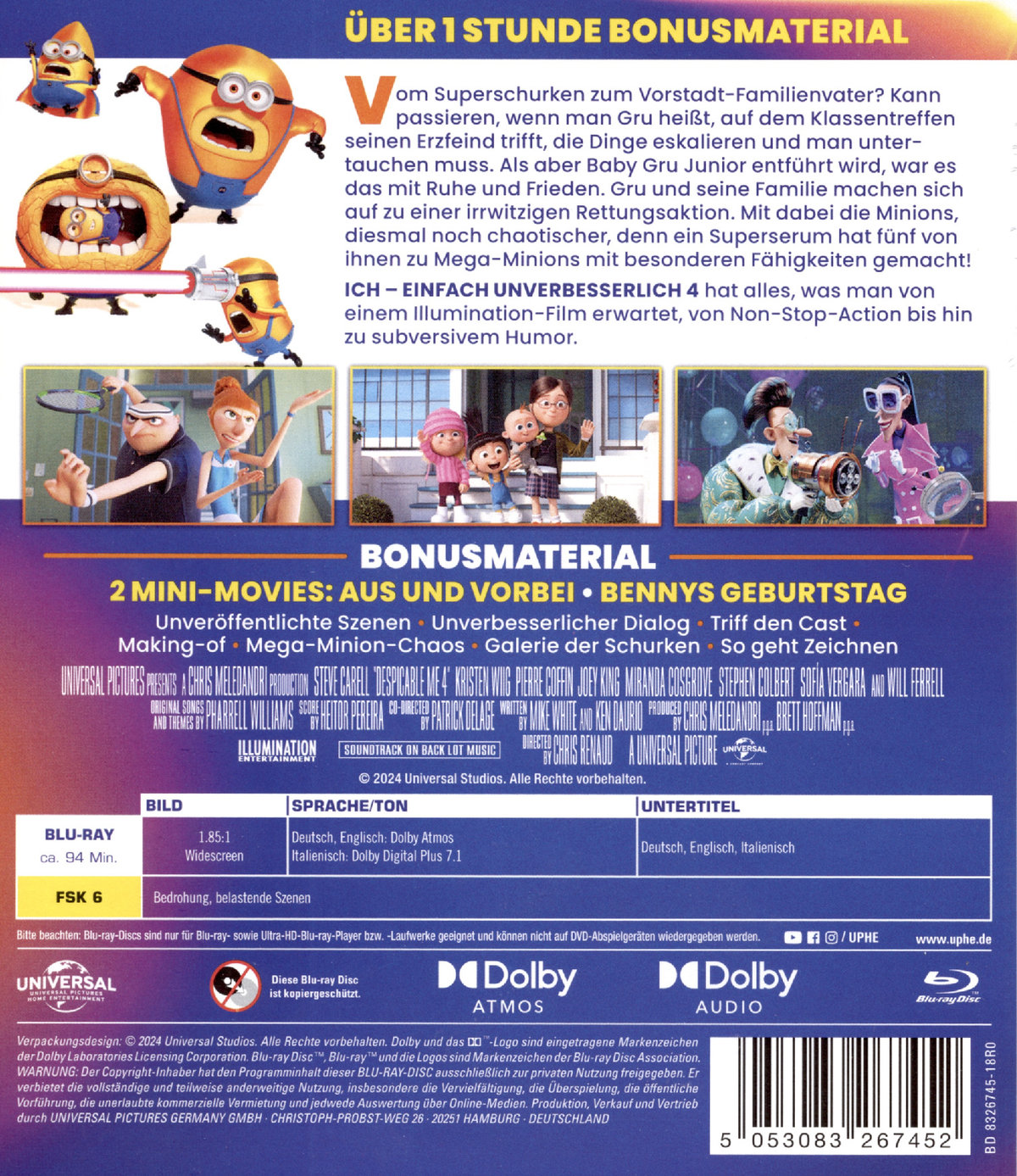 Vom Superschurken zum Vorstadt-Familienvater? Kann passieren, wenn man Gru heißt, auf dem Klassentreffen seinen Erzfeind trifft, die Dinge eskalieren und man untertauchen muss. Als aber Baby Gru Junior entführt wird, war es das mit Ruhe und Frieden. Gru und seine Familie machen sich auf zu einer irrwitzigen Rettungsaktion. Mit dabei die Minions, diesmal noch chaotischer, denn ein Superserum hat fünf von ihnen zu Mega Minions mit besonderen Fähigkeiten gemacht!ICH - EINFACH UNVERBESSERLICH 4 hat alles, was man von einem Illumination-Film erwartet, von Non-Stop-Action bis hin zu subversivem Humor.