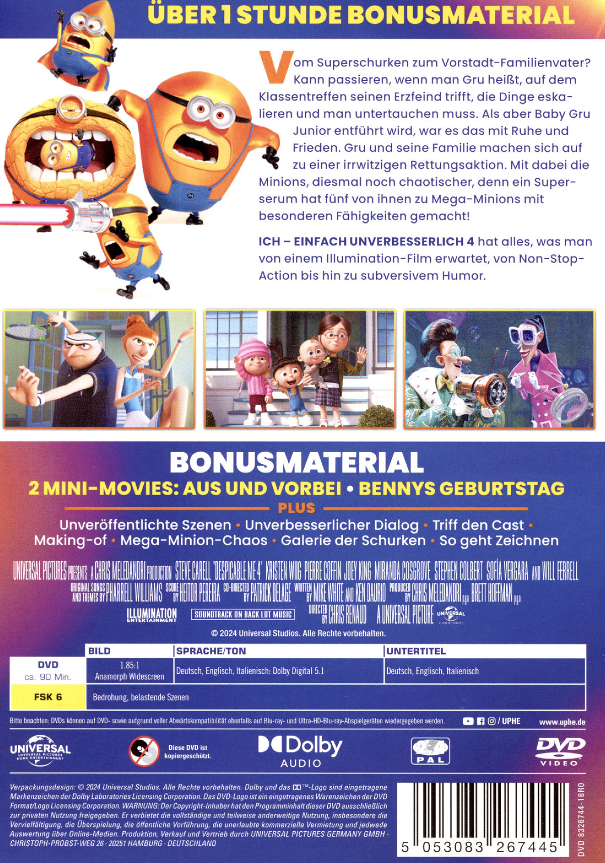 Enthält zwei Mini-Movies: Aus und vorbei,Bennys Geburtstag - Unveröffentlichte Szenen,Unverbesserlicher Dialog,Triff den Cast,Making of,Mega-Minion-Chaos,Galerie der Schurken,So geht zeichnen