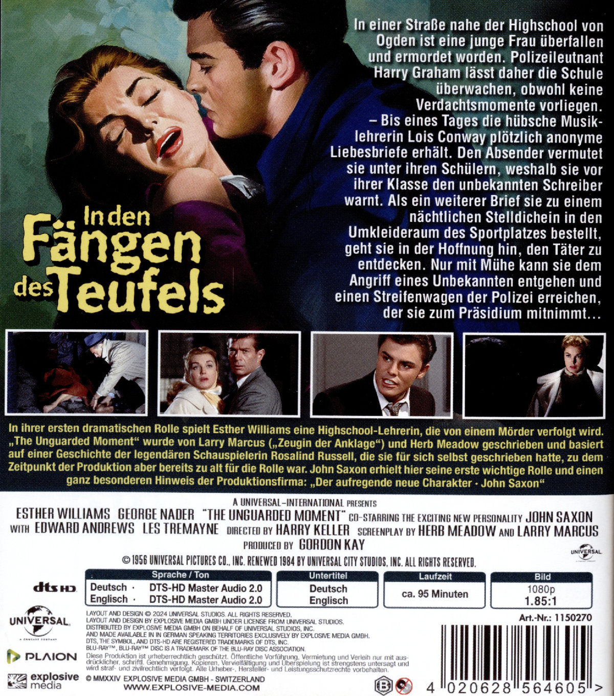 In einer seltenen dramatischen Rolle spielt Esther Williams eine Highschool-Lehrerin, die von einem Spanner verfolgt wird, bei dem es sich möglicherweise um denselben mörderischen Sexsüchtigen handelt, den die Polizei sucht. The IN DEN FÄNGEN DES TEUFELS wurde von Larry Marcus („Zeugin der Anklage“) und Herb Meadow („Lone Ranger“) zusammen mit der legendären Schauspielerin Rosalind Russell („Sein Mädchen für besondere Fälle“) geschrieben und ist ein stimmungsvoller Neo-Noir in Technicolor, in dem John Saxon („Der Mann mit der Todeskralle“) in einer seiner ersten großen Rollen und „Jerry Cotton“ George Nader („Das Haus der 1000 Puppen“) als ermittelnder Detektiv mitspielen. Regie führte Harry Keller.
