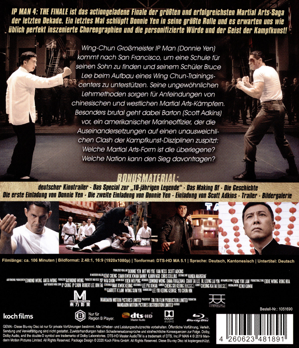 IP MAN 4: THE FINALE ist das actiongeladene Finale der größten und erfolgreichsten Martial Arts-Saga der letzten Dekade. Ein letztes Mal schlüpft Donnie Yen in seine größte Rolle und es erwarten uns wie üblich perfekt inszenierte Choreographien und die personifizierte Würde und der Geist der Kampfkunst!