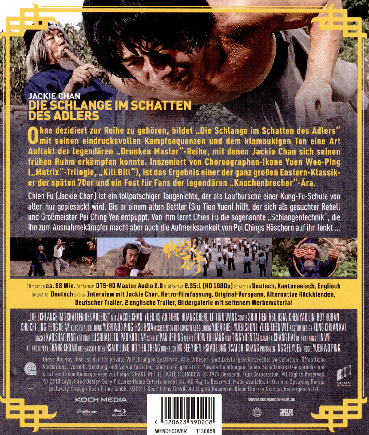 Ohne dezidiert zur Reihe zu gehören, bildet DIE SCHLANGE IM SCHATTEN DES ADLERS mit seinen eindrucksvollen Kampfsequenzen und dem klamaukigen Ton eine Art Auftakt der legendären DRUNKEN MASTER-Reihe, mit denen Jackie Chan sich seinen frühen Ruhm erkämpfen konnte. Inszeniert von Choreographen-Ikone Yuen Woo-Ping (MATRIX-Trilogie, KILL BILL), ist das Ergebnis einer der ganz großen Eastern-Klassiker der späten 70er und ein Fest für Fans der legendären „Knochenbrecher“-Ära.