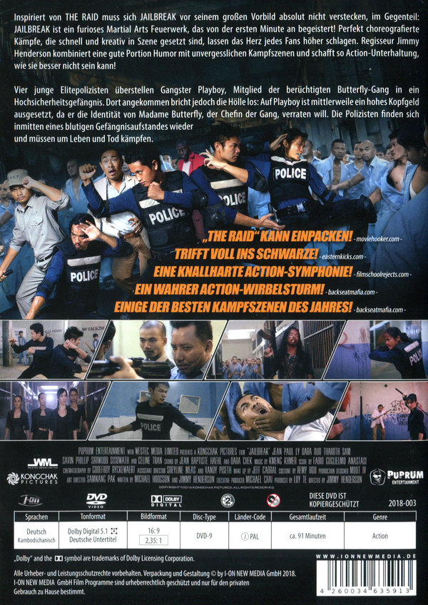 Vier junge Elitepolizisten überstellen Gangster Playboy, Mitglied der berüchtigten Butterfly-Gang in ein Hochsicherheitsgefängnis. Dort angekommen bricht jedoch die Hölle los: Auf Playboy ist mittlerweile ein hohes Kopfgeld ausgesetzt, da er die Identität von Madame Butterfly, der Chefin der Gang, verraten will. Die Polizisten finden sich inmitten eines blutigen Gefängnisaufstandes wieder und müssen um Leben und Tod kämpfen. Inspiriert von THE RAID muss sich JAILBREAK vor seinem großen Vorbild absolut nicht verstecken, im Gegenteil: JAILBREAK ist ein furioses Martial Arts Feuerwerk, das von der ersten Minute an begeistert! Perfekt choreografierte Kämpfe, die schnell und kreativ in Szene gesetzt sind, lassen das Herz jedes Fans höher schlagen. Regisseur Jimmy Henderson kombiniert eine gute Portion Humor mit unvergesslichen Kampfszenen und schafft so Action-Unterhaltung, wie sie besser nicht sein kann! Pressezitate: • „Ein wahrer Action-Wirbelsturm!" - (backseatmafia.com) • „Einige der besten Kampfszenen des Jahres!“ - (backseatmafia.com) • „Absolut hochklassige Martial Arts Szenen!“ - (easternkicks.com) • „Überwältigend!“ - (hollywoodreporter.com) • „Eine knallharte Actionsymphonie!“ - (filmschoolrejects.com) • „Großartige Kampfszenen!“ - (cityonfire.com) • „THE RAID“ kann einpacken!" - (moviehooker.com) • „Wie ein Schlag in die Fresse!“ - (easternkicks.com)